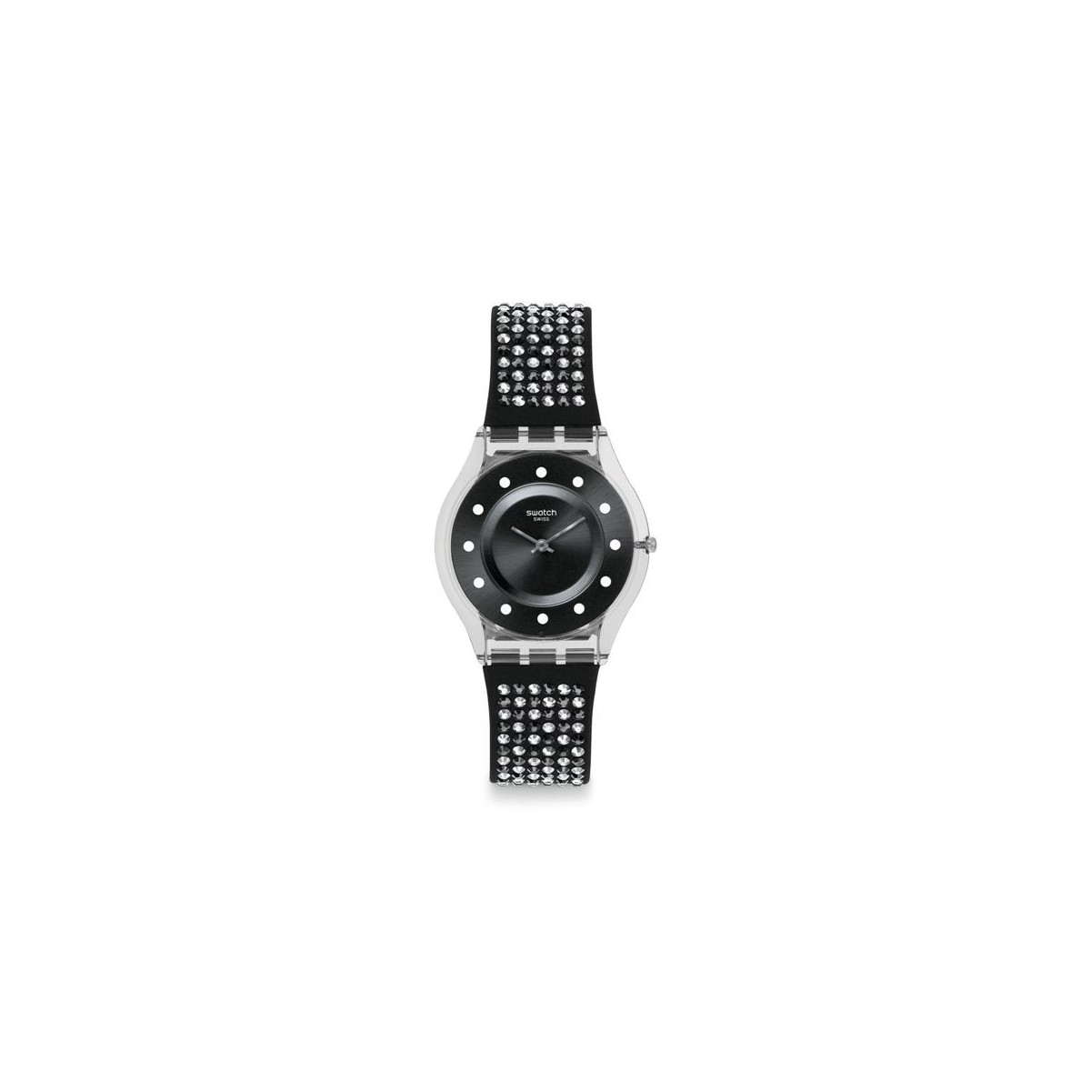 Swatch watch Classic series LIGHTS ON polycarbonate case and fabric and leather bracelet with Rhinestones, 2014, new collection quartz movement, from precious and elegant design