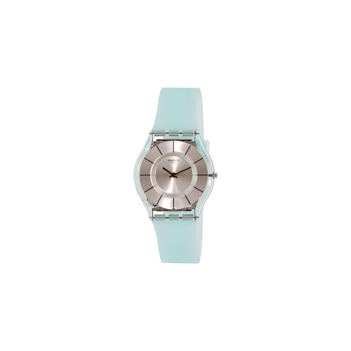 A stunning design that looks great at any time of the year, the SUMMER BREEZE (SFK397) watch is set apart with a sun-brushed silver-tone dial featuring dark-grey and mint-green indexes and a clean, numberless silhouette. A clear case and transparent strap of cool mint-green complete the look. Width Millimeter 34.00 mm Thickness Milimeter : 3.90 mm Height Millimeter : 38.00 mm