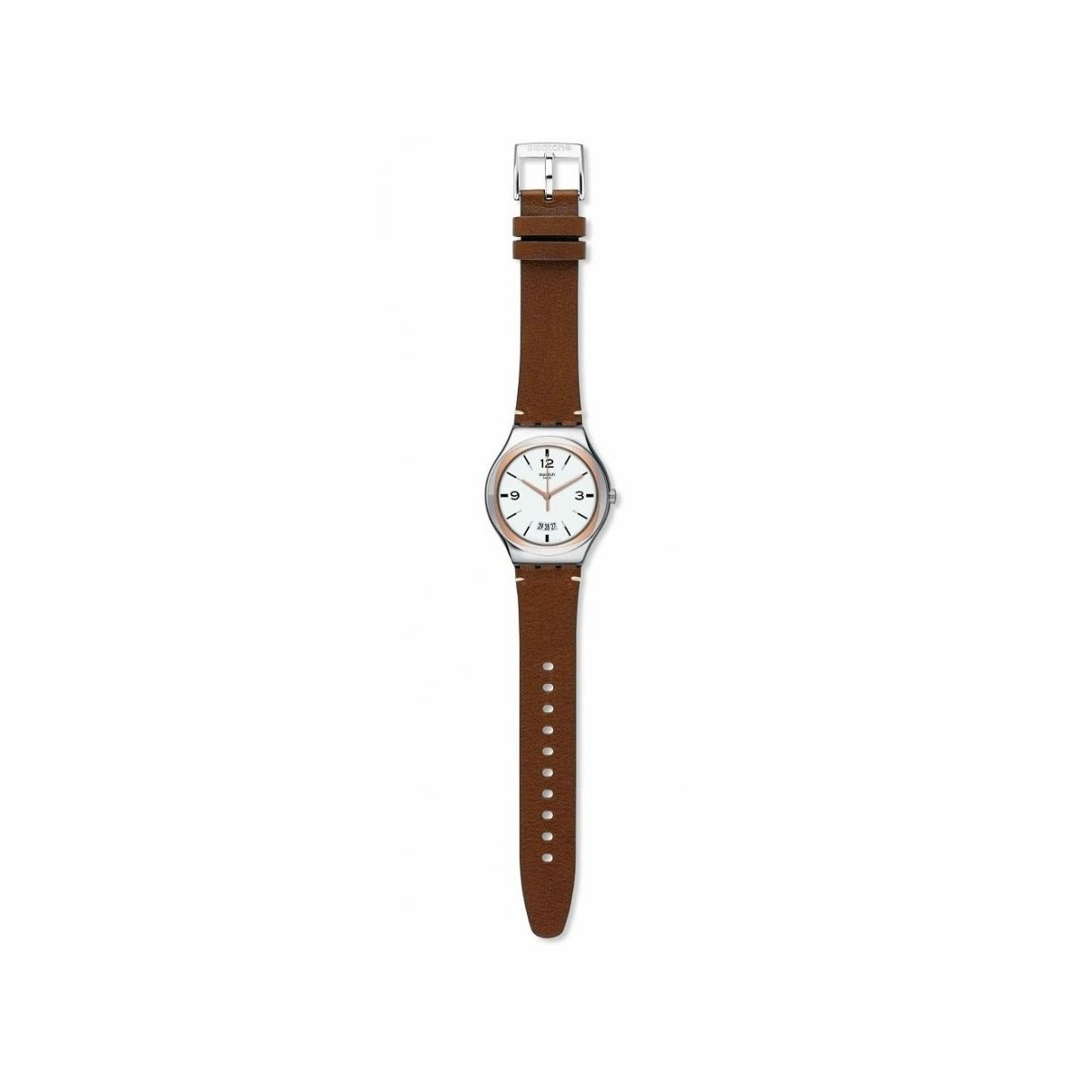 Irony man watch with brown leather strap, stainless steel case with rosé profiling, white dial, pink gold hands and bezel small size