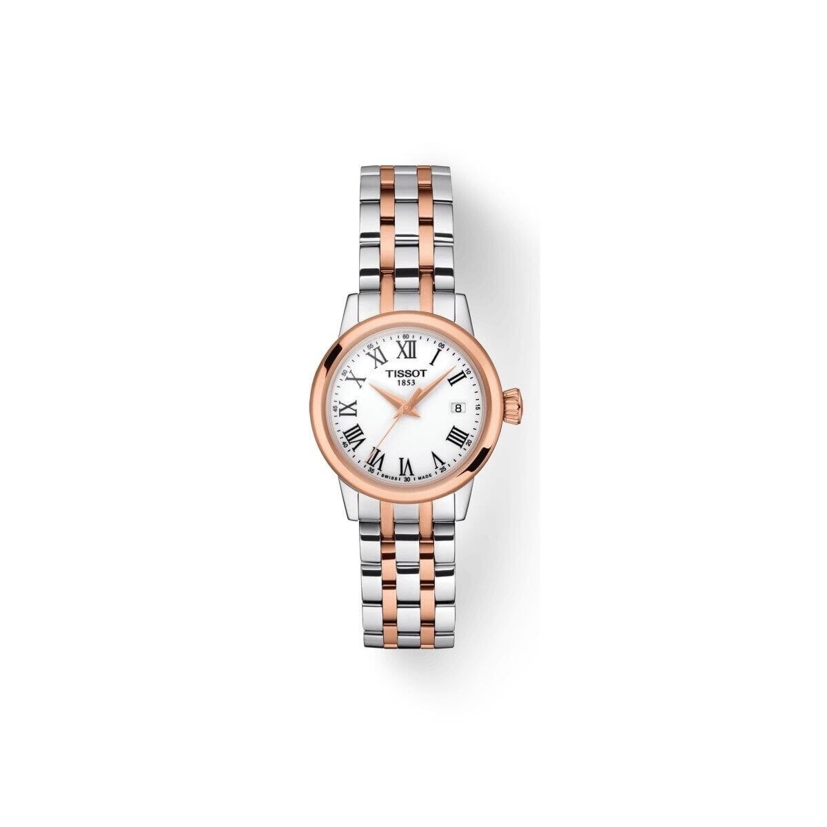 Women's watch from the T-Classic Dream collection made of two-tone steel with rosé PVD treatment. The watch has a time-only function with a Swiss quartz movement. The steel link strap with pink details joins the 28mm case with pink bezel and scratch-resistant sapphire crystal upright, which protects the eggshell white dial with Roman indexes, rosé hands and date window at three o'clock. Modern watch with a refined and timeless design suitable for any occasion to instill character to your look.