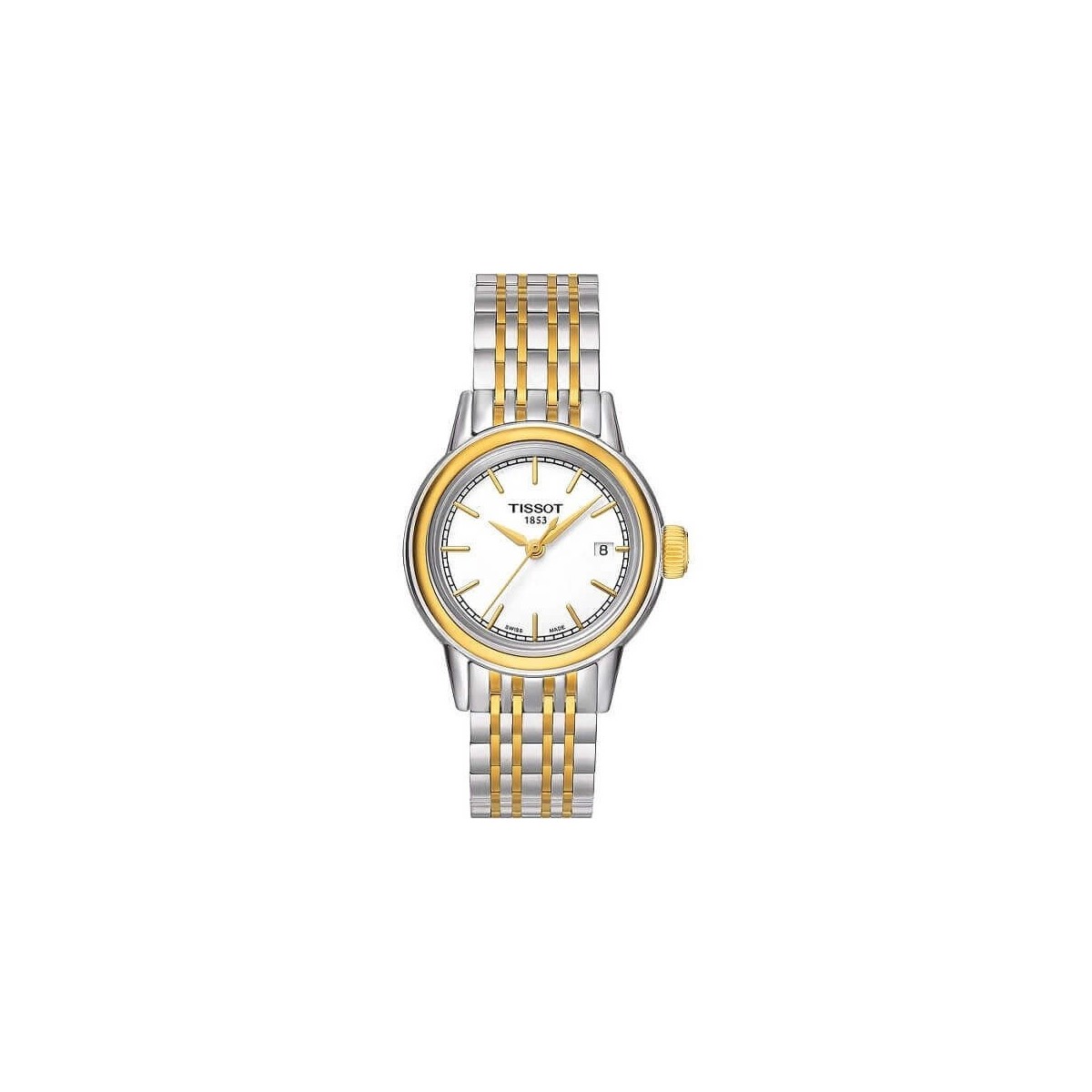 Carson Lady Tissot watch, from the T-Classic collection, with only time function and Swiss movement, quartz, made of two-tone 316L stainless steel, with round case with a diameter of 29.5mm and sapphire and scratch-resistant glass that protects the colored dial white with golden indexes and hands.