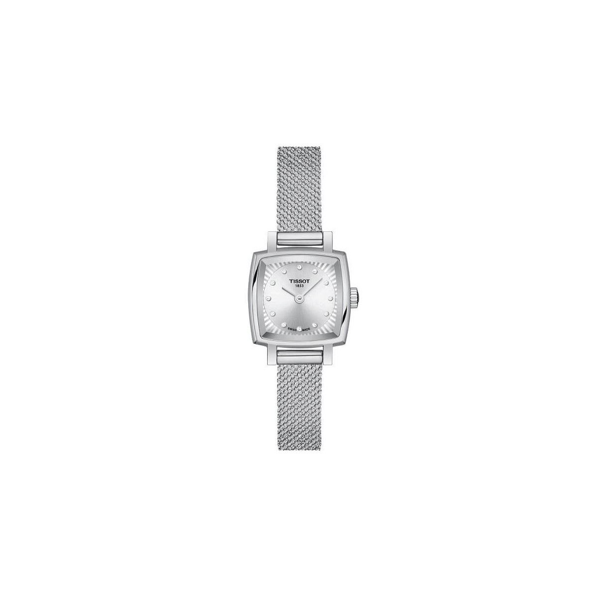 Lovely Square Tissot women's watch, from the T-Lady collection, with Swiss quartz movement made of 316L stainless steel, with a square case with a diameter of 20mm, sapphire and scratch-resistant glass that protects the silver-colored dial with twelve diamonds that act as indexes, mesh knit strap with jewel closure.