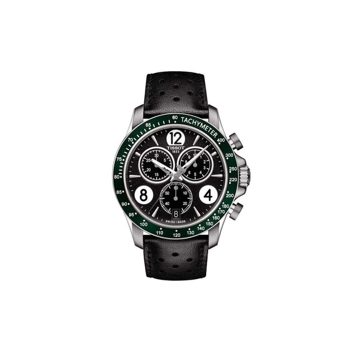 Tissot V8 men's watch, from the T-Sport collection, with chronograph function and quartz movement. The watch is made with black leather strap, 43 mm steel case with green bezel and black dial with alternating indexes and Arabic numerals, LumiBrite hands and date window at 6 o'clock. Closure with standard buckle. The watch has some additional functions: 30 Minute And 1/10 Second Counters, Central 60 Second Chronograph Hand, Add And Split Functions.
