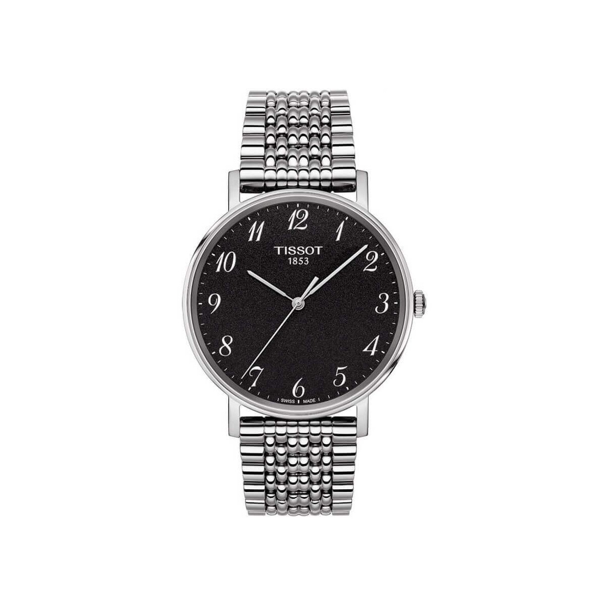 Watch suitable for both sexes Tissot Everytime, from the T-Classic collection, with only time function and Swiss quartz movement. The watch is composed of a mesh bracelet made of stainless steel with a polished finish, a medium 38 mm steel case mounting a flat sapphire crystal and a black dial with raised Arabic numerals and steel hands.
