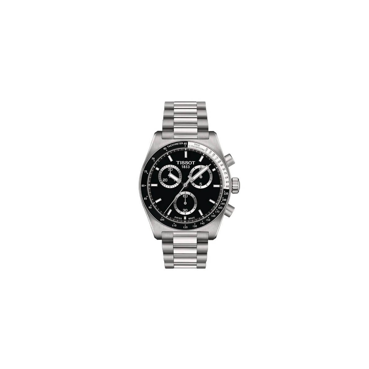 T-Sport PR516 quartz line chronograph watch, 40mm case and steel bracelet, black dial with luminova hands. Deployment clasp
