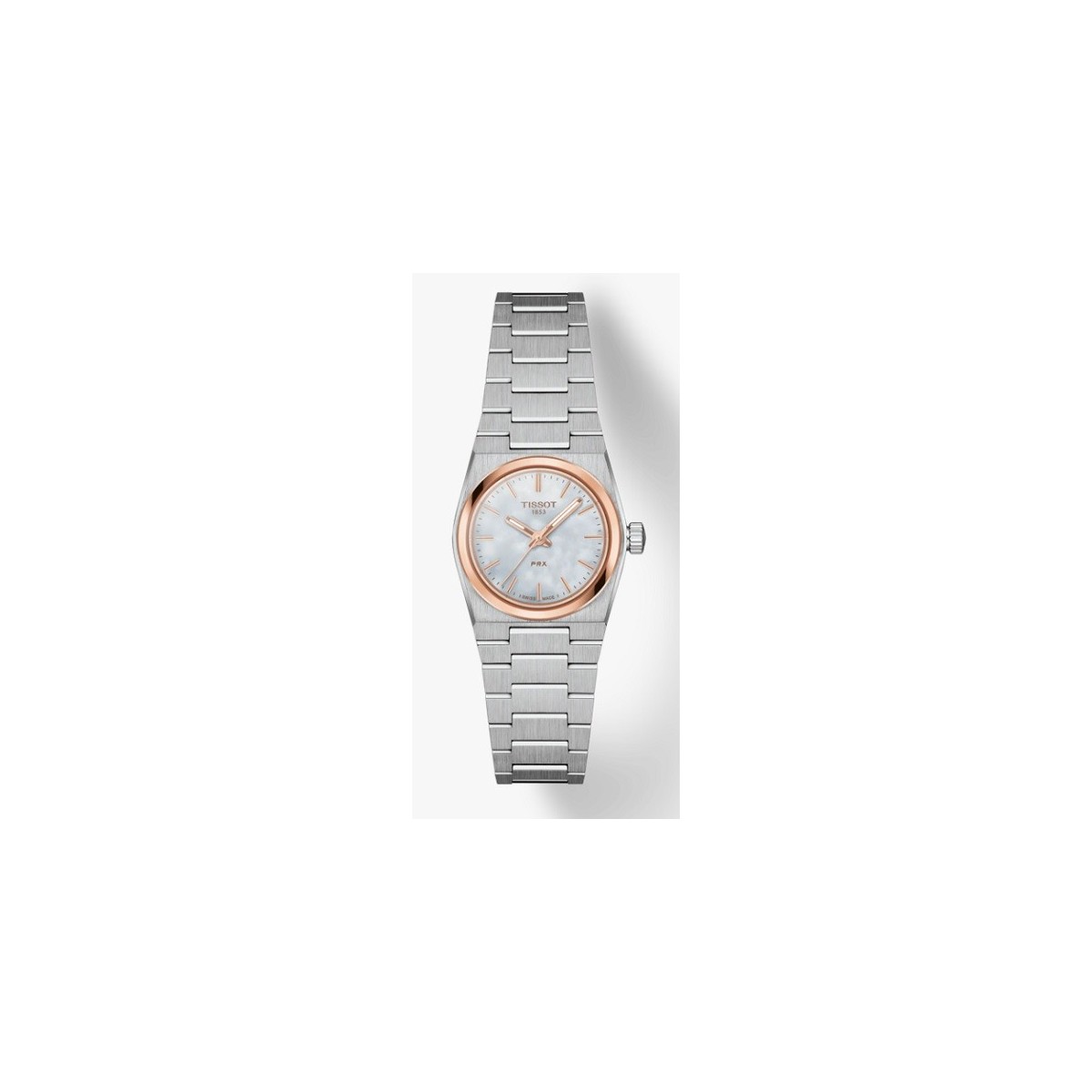 Tissot PRX 25mm steel with mother-of-pearl dial and rose gold bezel.