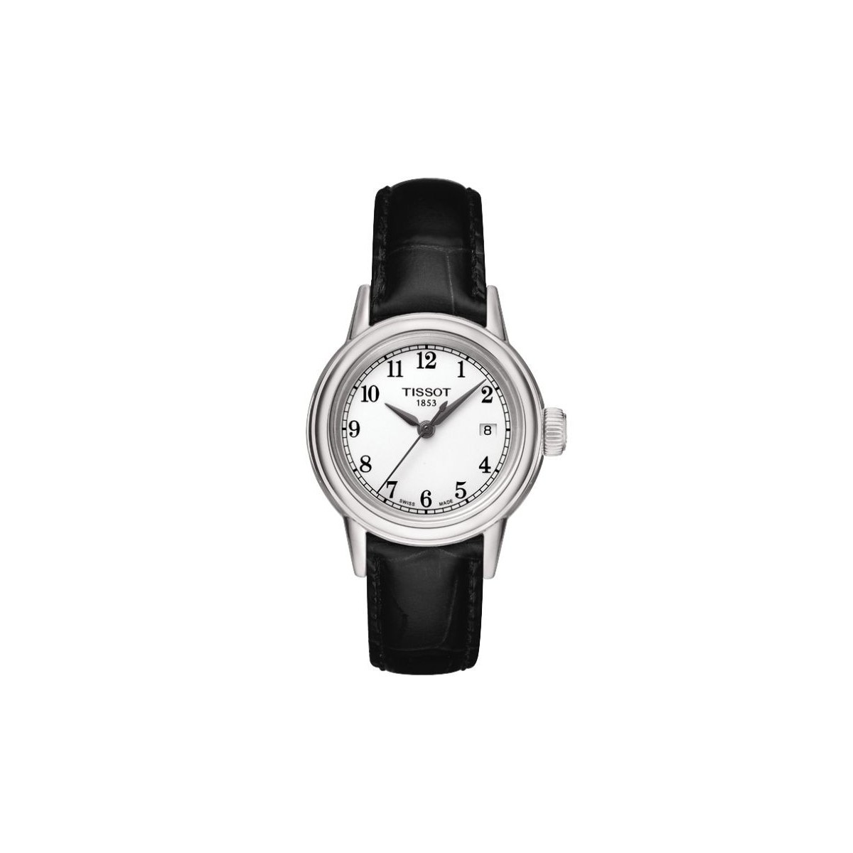 Stainless steel case with a black croco-embossed leather strap. Fixed stainless steel bezel. White dial with black hands and Arabic numeral hour markers. Minute markers around the outer rim. Dial Type: Analog. Date display at the 3 o'clock position. Quartz movement. Scratch resistant sapphire crystal. Solid case back. Case diameter: 29 mm. Round case shape. Butterfly clasp. Water resistant at 30 meters / 100 feet. Functions: date, hour, minute, second. Casual watch style. Tissot Carson White Dial Black Leather Ladies Watch