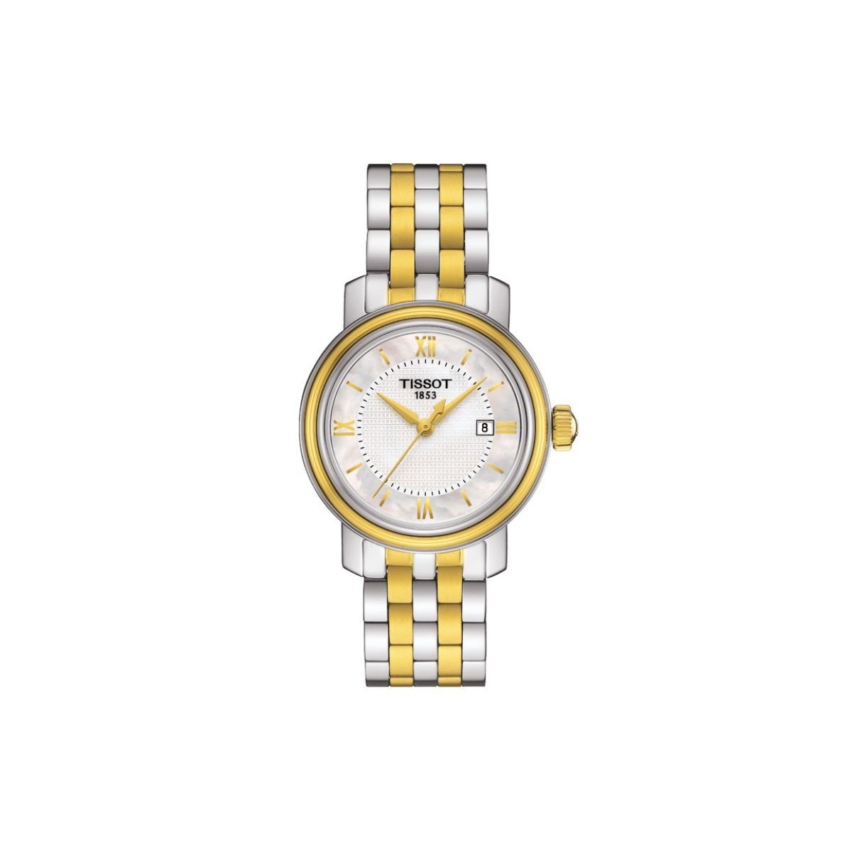 Bridgeport woman watch with white mother-of-Pearl Dial, quartz movement polished stainless steel conturino and golden.