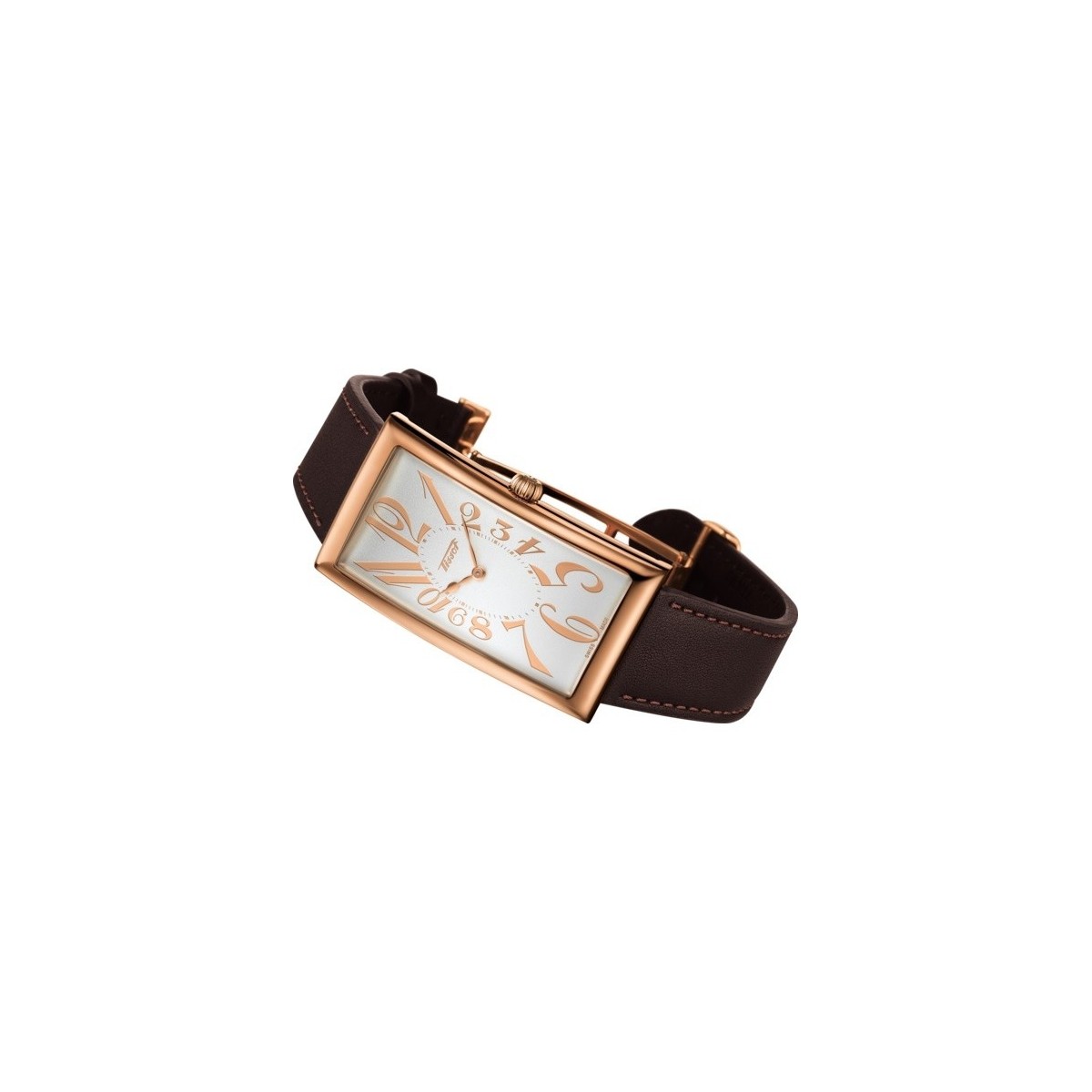 Rectangular quartz watch Heritage Banana Centenary Edition with rosè pvd steel case and brown leather strap, silver dial and golden Arabic numerals.
