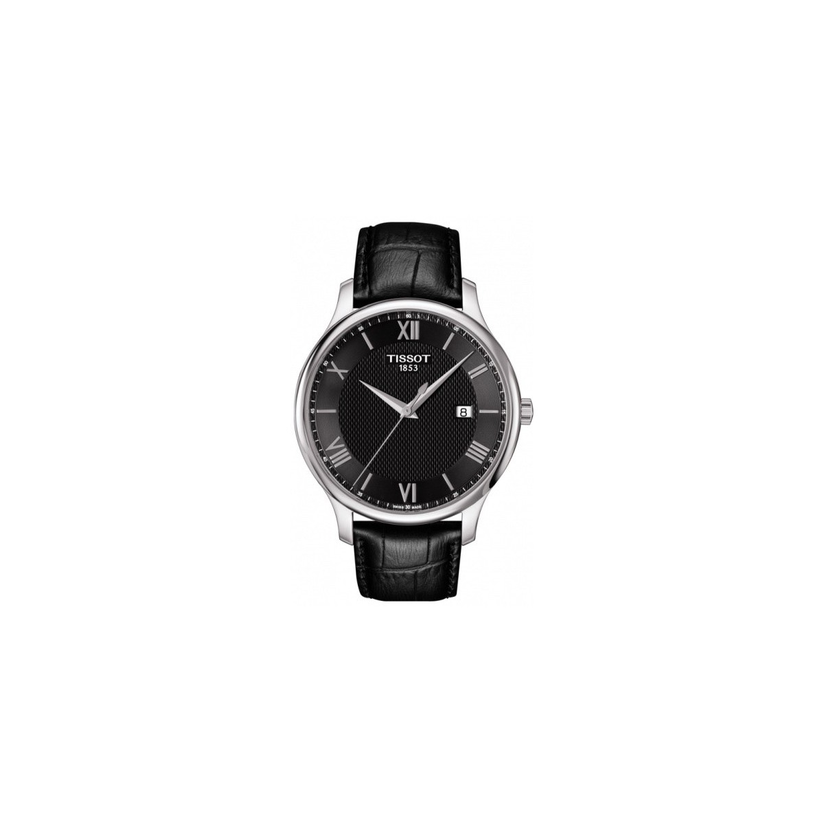 Men's Tradition watch collection with black crocodile print leather strap, stainless steel case, black dial with Roman numeral hour markers and silver hands