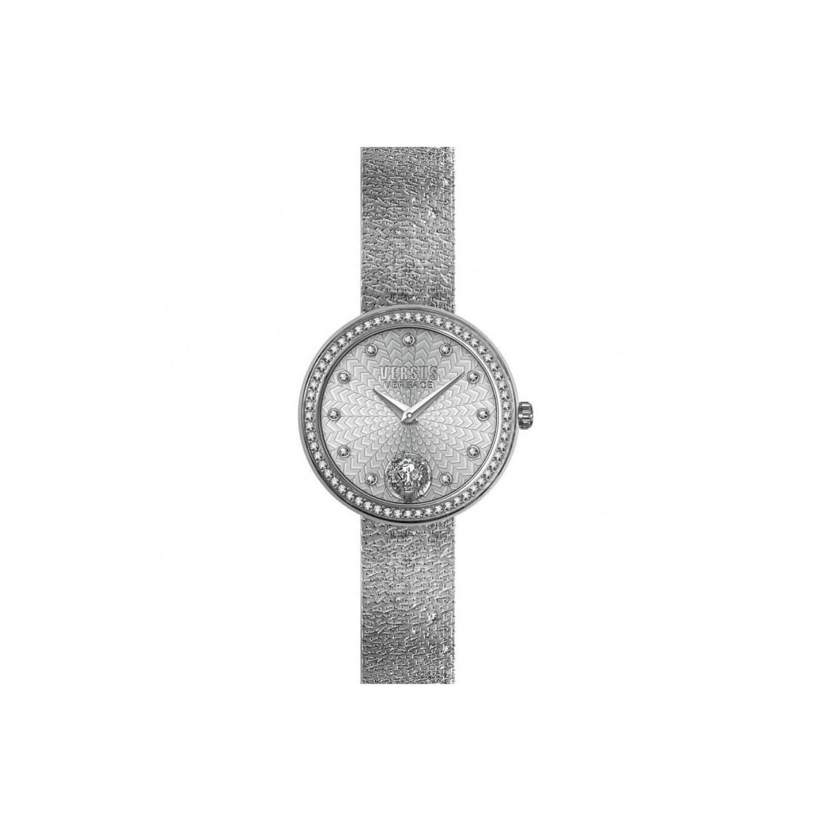 Versus Versace watch with silver-colored mesh strap, silver dial with special ray pattern, crystal indexes and Versace logo at six o'clock.