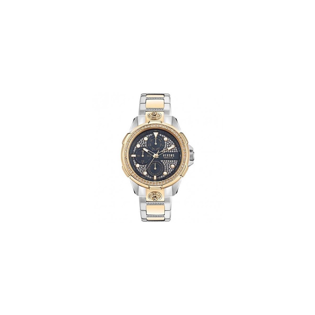 Versus Versace 6eme Arrondissement men's watch in mixed steel with 46 mm case with crystals, two-tone crystal bracelet with folding clasp, blue dial with crystals and analog display.