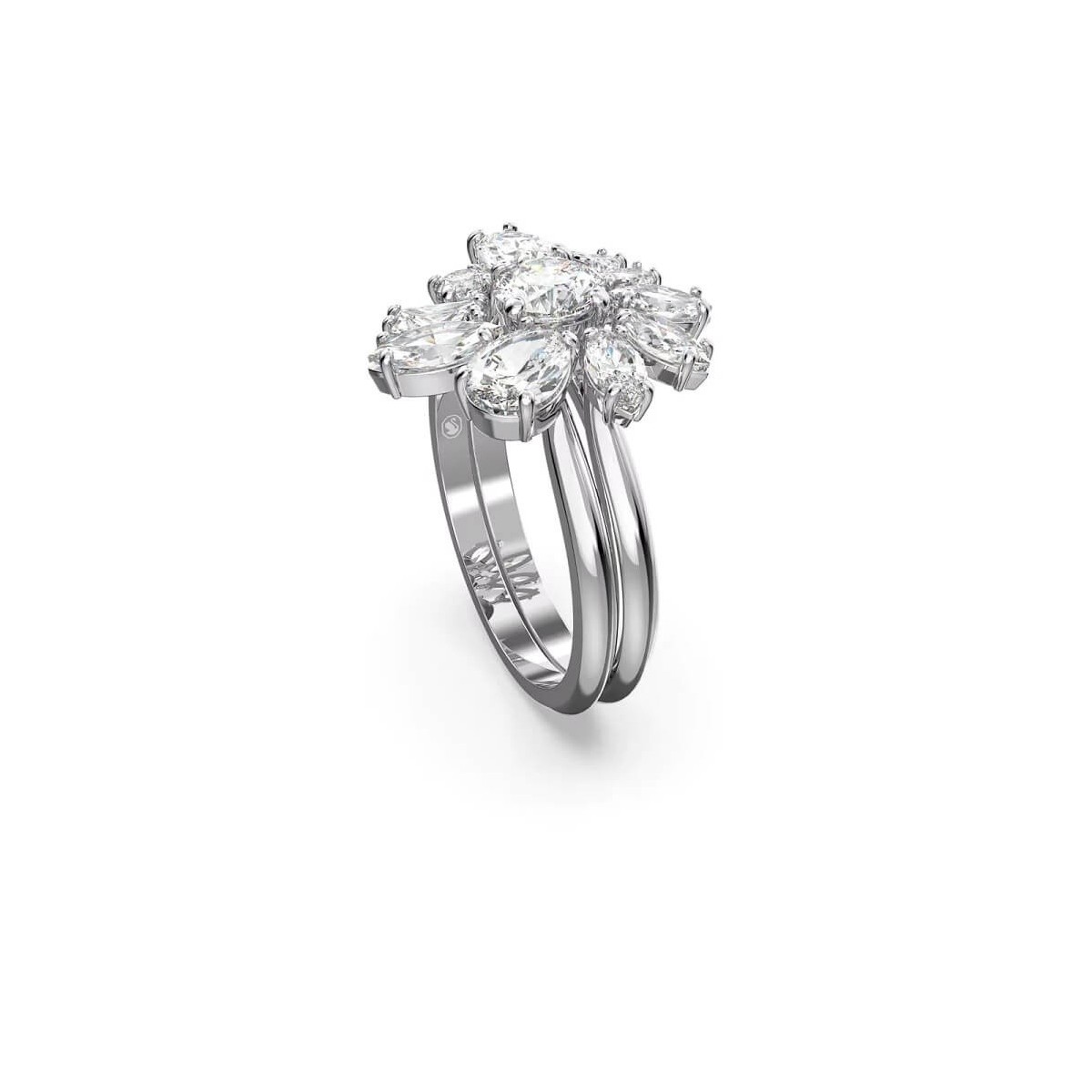 Swarovsky feminine ring, from the Gema Cocktail collection, made of rhodium-plated metal and composed of a double band with a central floral motif made of white crystals in a mix of different cuts.