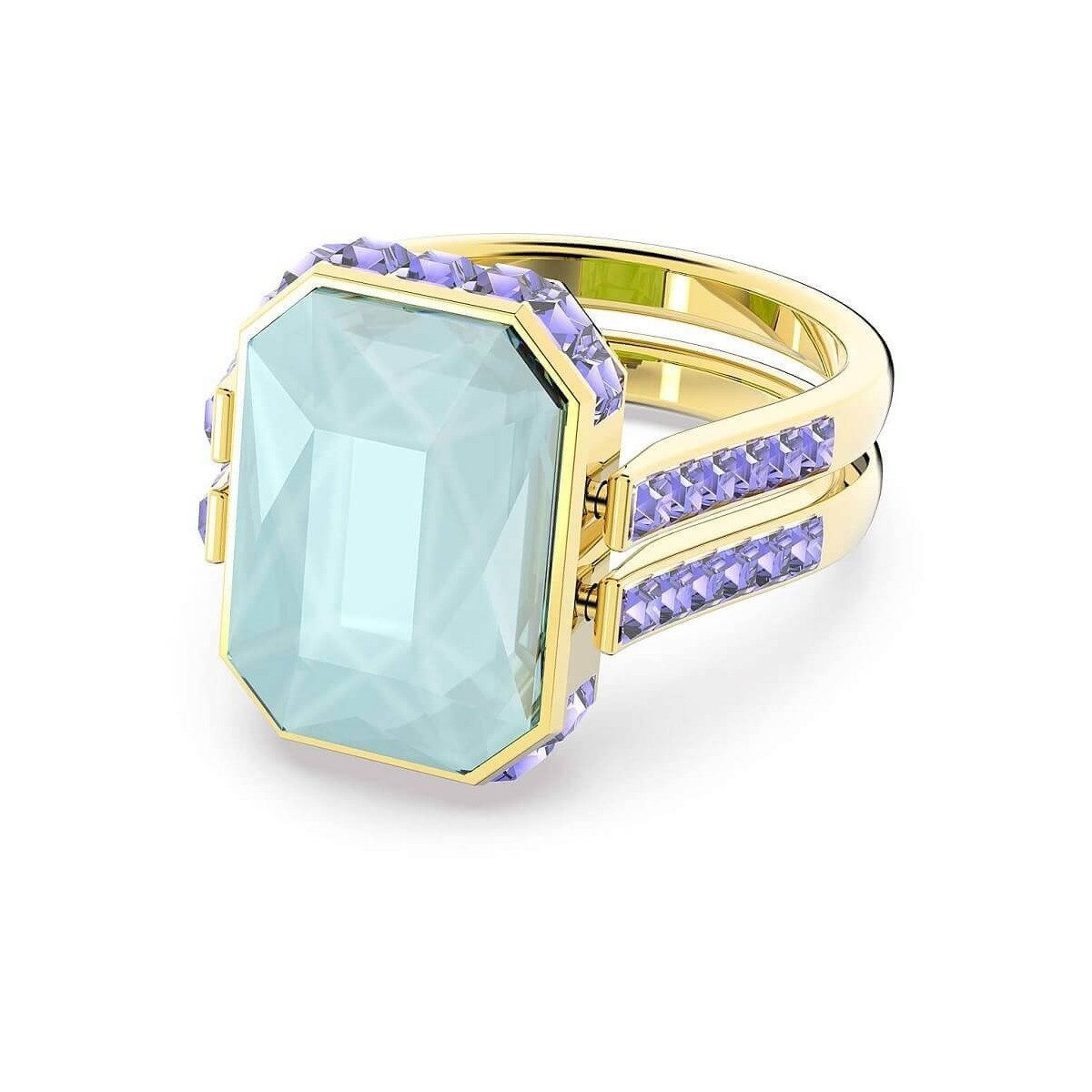 Swarovski women's ring, from the Orbita collection, made in a delicate yellow gold plating. the jewel has an octagonal-cut crystal in aqua green color set between various lilac baguette-cut crystals also present on the double band. The peculiarity of this ring is the back with lime green stone that allows the jewel to be worn in both shades.