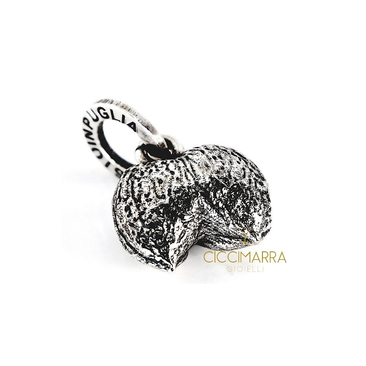 The almond, fruit of the almond blossom, is considered a symbol of rebirth and fruitfulness, and is a Pugliese custom during the harvest, looking for double almonds and giving them to children as if they were good luck charms. Made in Italy. Handmade with the lost wax technique.