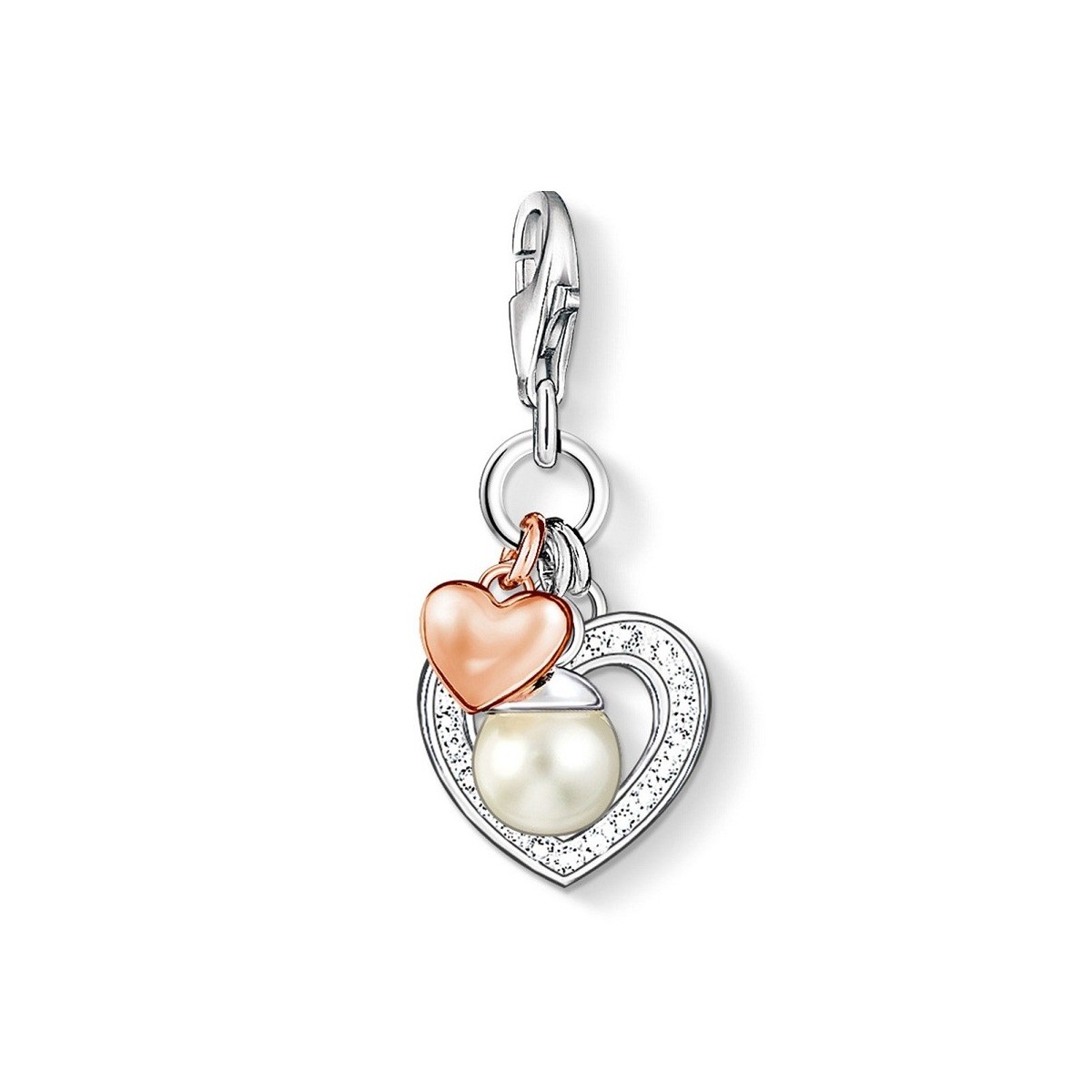 Club line consisting of three heart pendant pendants, sterling silver 925 heart pierced with pave white cubic zirconia, synthetic, tiny little heart with the same 18-carat pink gold plated material, and a Cultured Freshwater Pearl