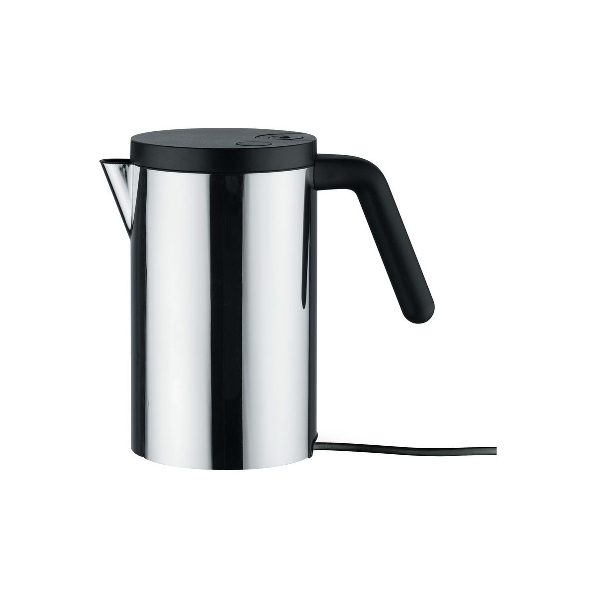 Alessi electric kettle in 18/10 stainless steel with handle and lid, in black thermoplastic resin-Design: Wiel Arets 2009