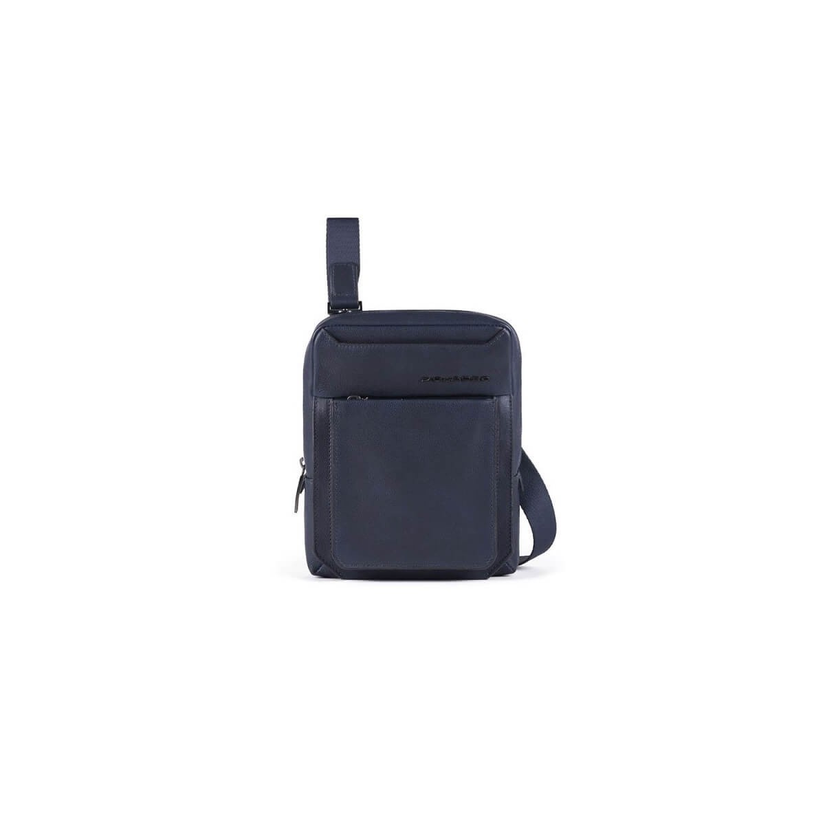 Tallin model bag in blue leather, with zip closure, adjustable shoulder strap and one zip pocket. Inside a compartment with pen holder, mobile phone holder and mini Ipad holder.
