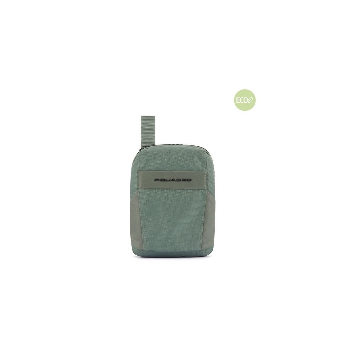 Organized bag from the Woody collection in water-resistant recycled fabric and leather with shoulder strap, green color with iPad mini compartment, internal cell phone pocket and pen holder.