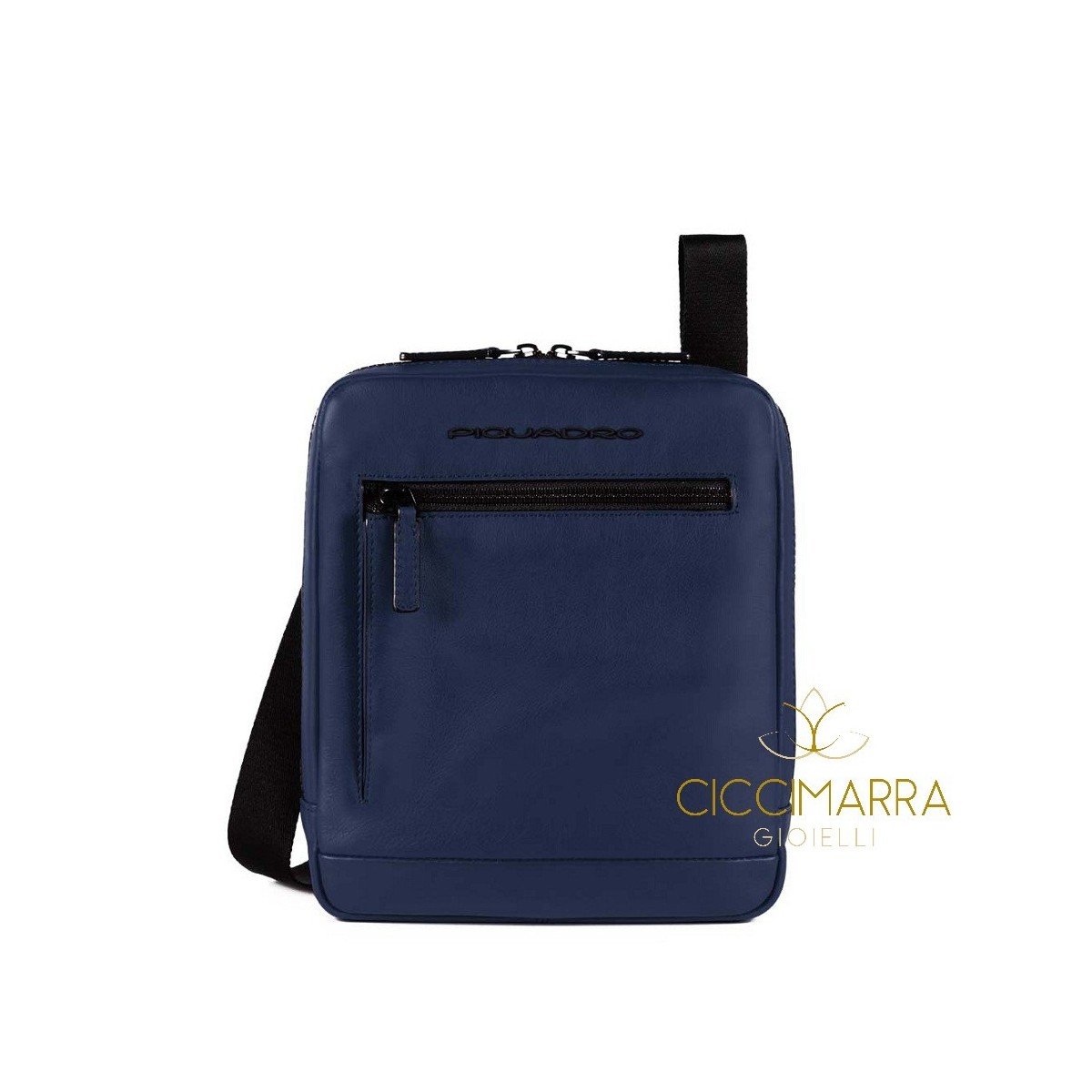 Men's bag in blue leather with Ipad mini compartment and mobile phone holder. The Setebos line is characterized by soft shapes and black contrast finishes; the calfskin has a semi-gloss finish that is soft to the touch.