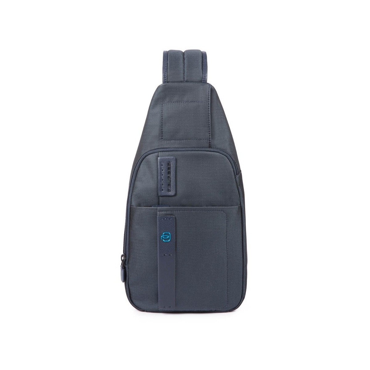 Man shoulder bag in blue fabric with PAD collection door. The Pulse P16 line is characterized by the combination of materials with different textures, which enhances the original design of the collection: soft calfskin combined with different types of fabric to satisfy any taste. All accessories are in an elegant matt black finish.