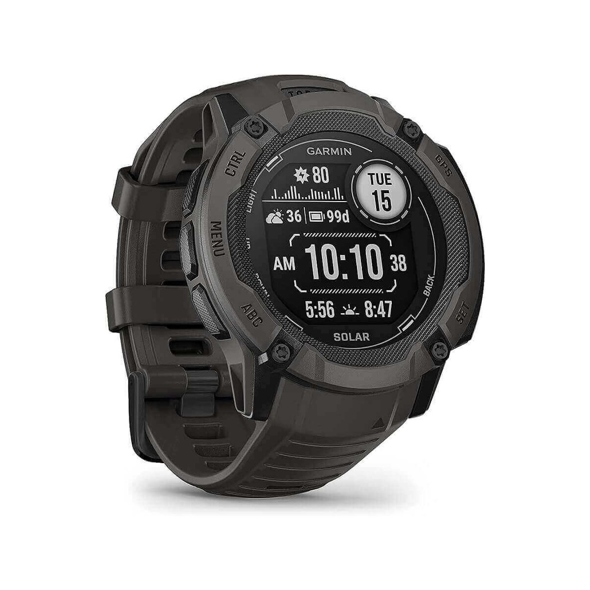 Instinct 2X Solar smartwatch with black graphite silicone strap, 50 mm case. The solar recharged lens allows a longer use. Advanced features for health and sport