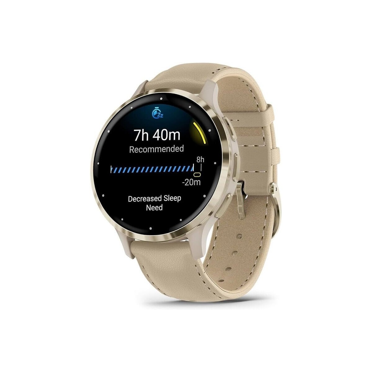 Venu 3S Lunetta Soft Gold smartwatch with 41 mm case and double strap, leather and silicone, light gray colour. Advanced features for health and convenience of making calls.