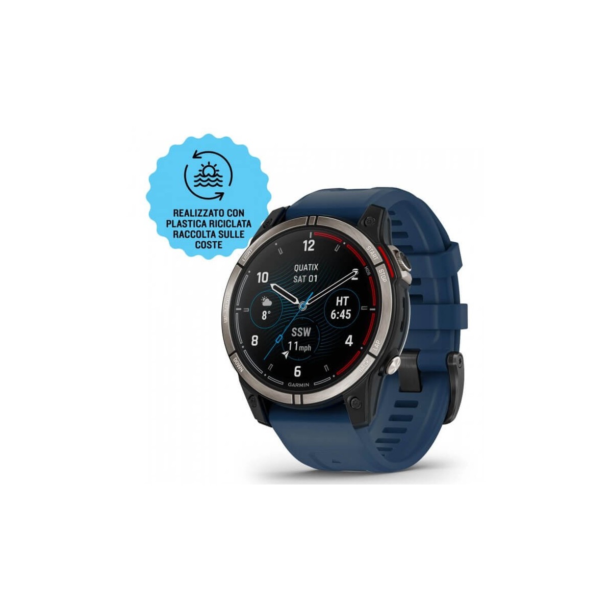 Garmin Quatix 7 Pro watch with 47 mm titanium case and blue silicone strap. Bright AMOLED color screen and built-in LED flashlight, up to 16 days battery life, with advanced health and fitness monitoring features that give you a better understanding of what's happening in your body.