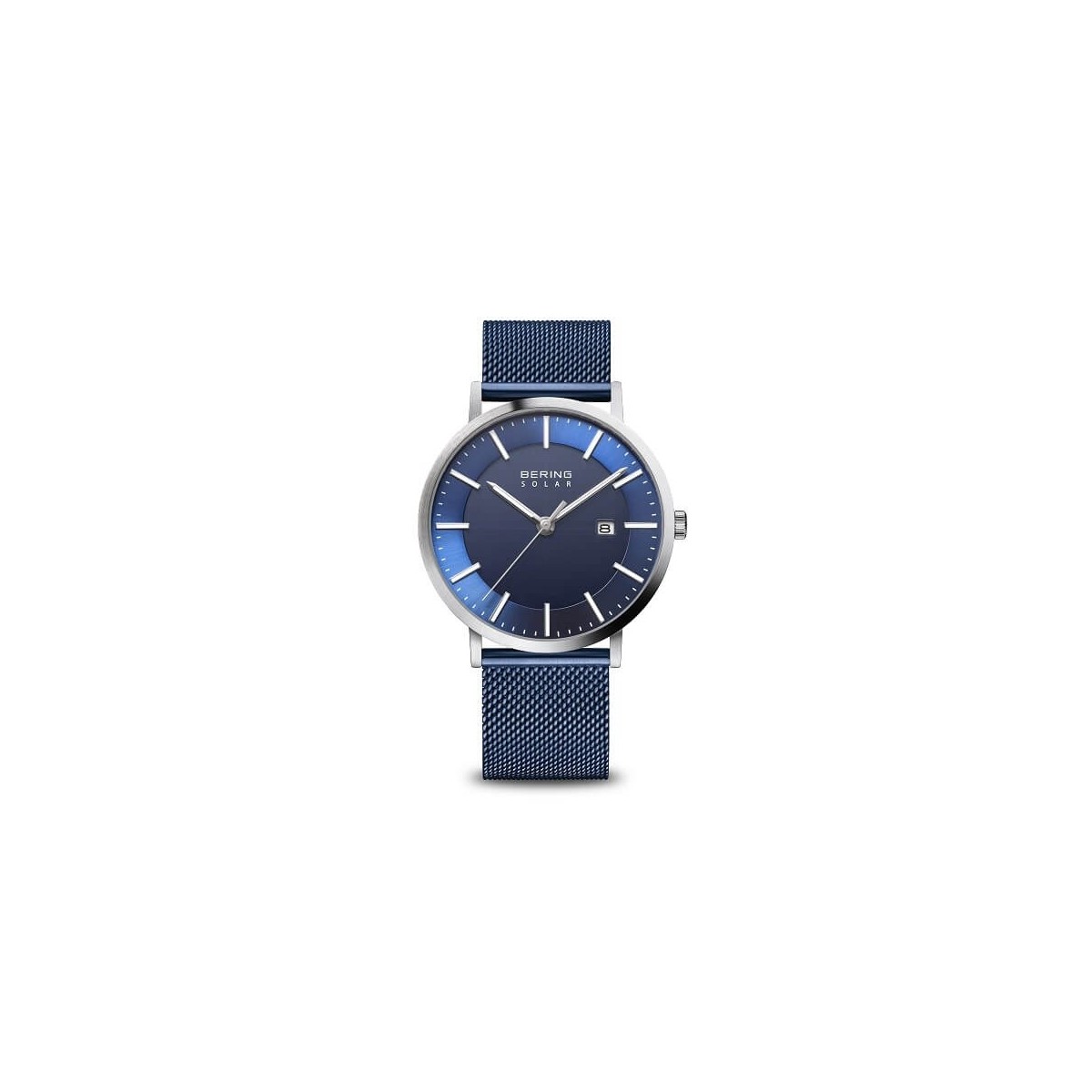 Bering watch belonging to the Solar collection. Made of bright blue stainless steel, with mGLIA milano strap, solar movement, flat case with blue scratch-resistant sapphire crystal.