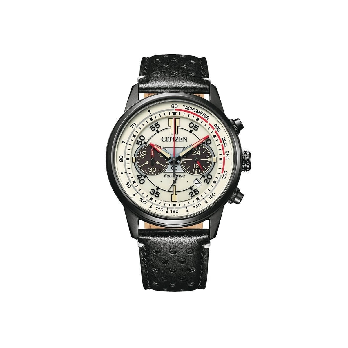 Men's watch from the Crono Racing collection with solar-powered chronograph movement, burnished steel case and black leather strap worked with small holes. The beige dial with date is with two-tone blue and red hands with red details. It mounts the precious and tested Citizen Eco-Drive movement that captures the light by storing it in a special accumulator and that allows the watch to operate for whole months even in the total absence of light. It can be recharged with any light source, from the smallest light bulb to direct sunlight.