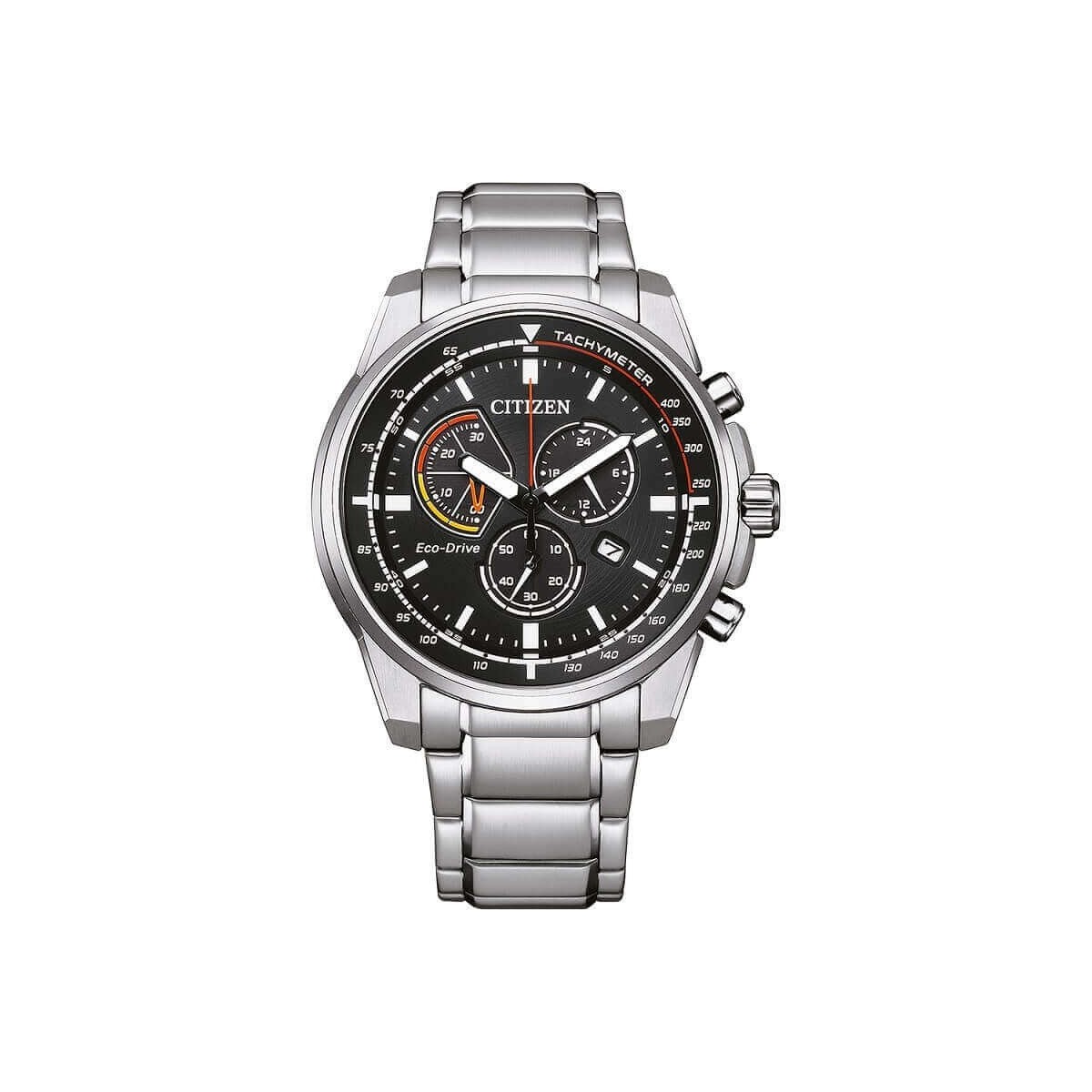 Citizen men's watch, from the Active collection, with chronograph function and Eco-Drive movement, solar with power reserve up to 270 days. Watch made of 316L brushed steel with link bracelet, 44 mm case with screw-locked bottom and black dial with indexes and hands with LumiBrite and orange seconds hand. Deployant clasp.