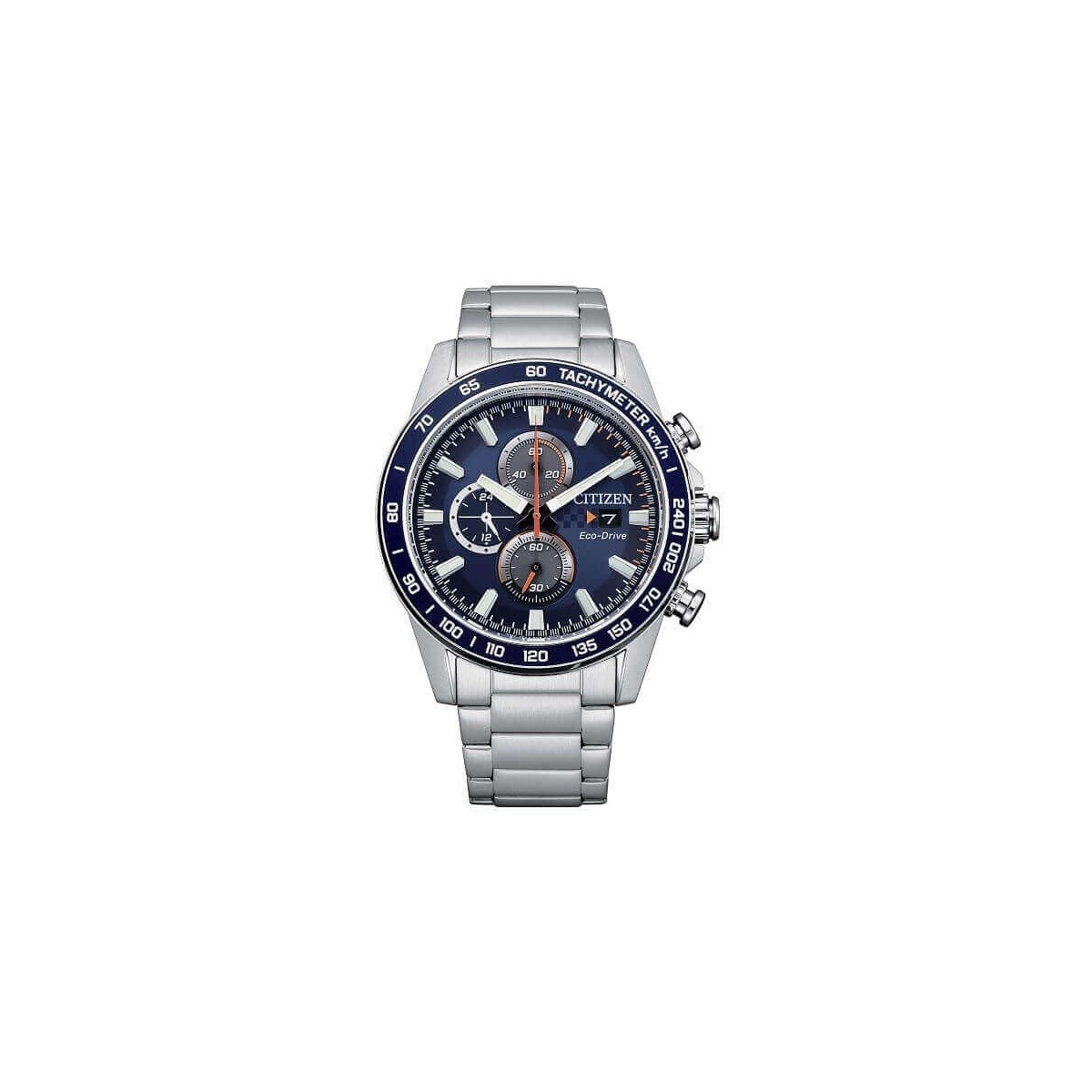 Citizen men's chronograph watch, from the Racing collection, with Eco-Drive movement, solar with power reserve up to 270 days, 44 mm steel case with screw-down bottom, aluminum bezel, mineral glass and blue analogue dial. Brushed steel bracelet with safety clasp.