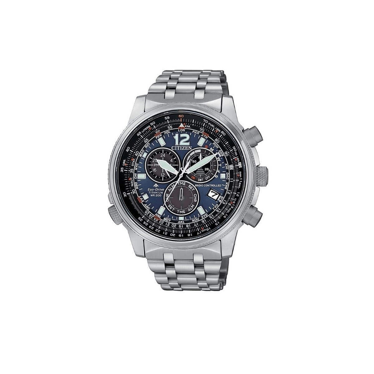 Citizen men's watch, from the Crono Pilot collection, with 5-channel radio-controlled function: receives the time signal of the USA, Europe, China and Japan and with Eco-Drive movement, solar with power reserve up to 10 months.