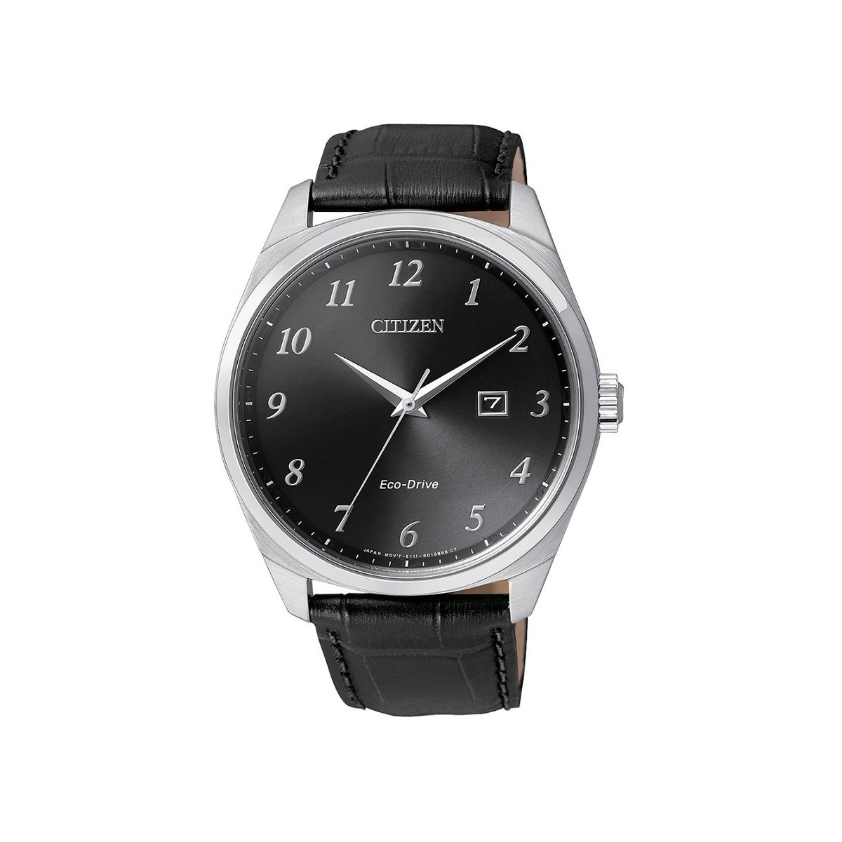 Solar watch with movement only time with date eco-drive Collection with stainless steel case and black leather strap, black dial and hands silver.