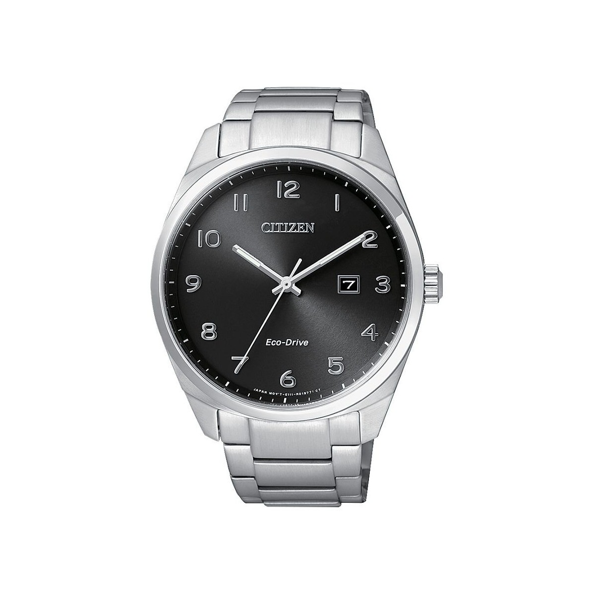 Solar watch with movement only time with date eco-drive Collection with stainless steel case and bracelet, black dial and white hands.