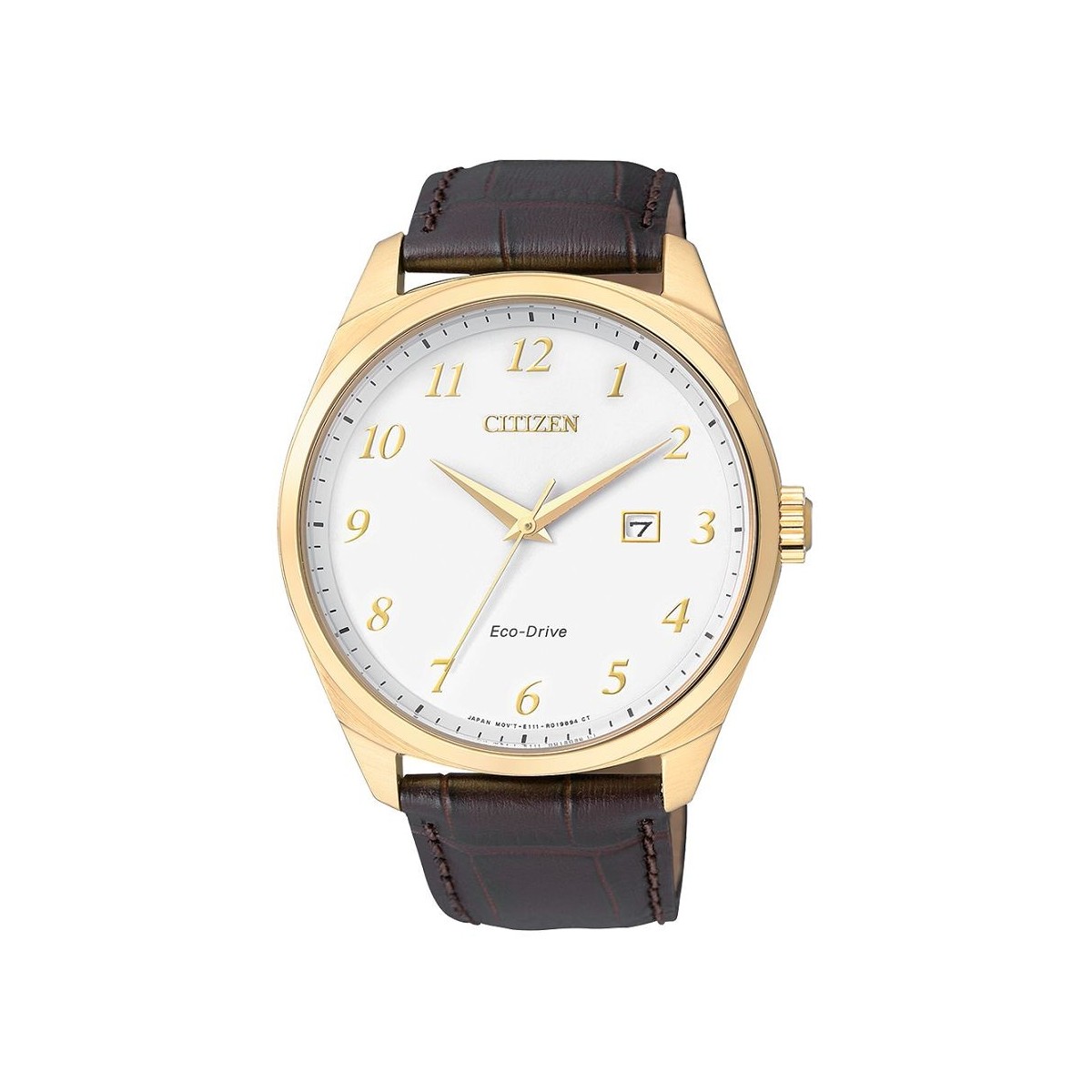 Solar watch with movement only time with date eco-drive Collection with gold plated stainless steel case and brown leather wrists bands, White Dial and hands.