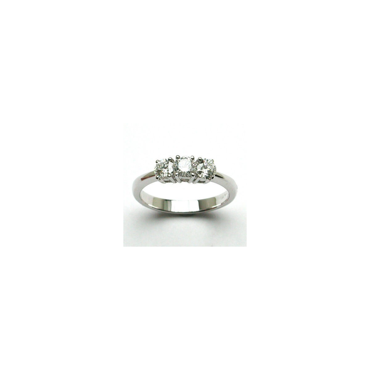 Trilogy ring with 0.75 carat brilliant cut natural diamonds, 4-prong setting. Line 3 Diamonds, in 18kt white gold.