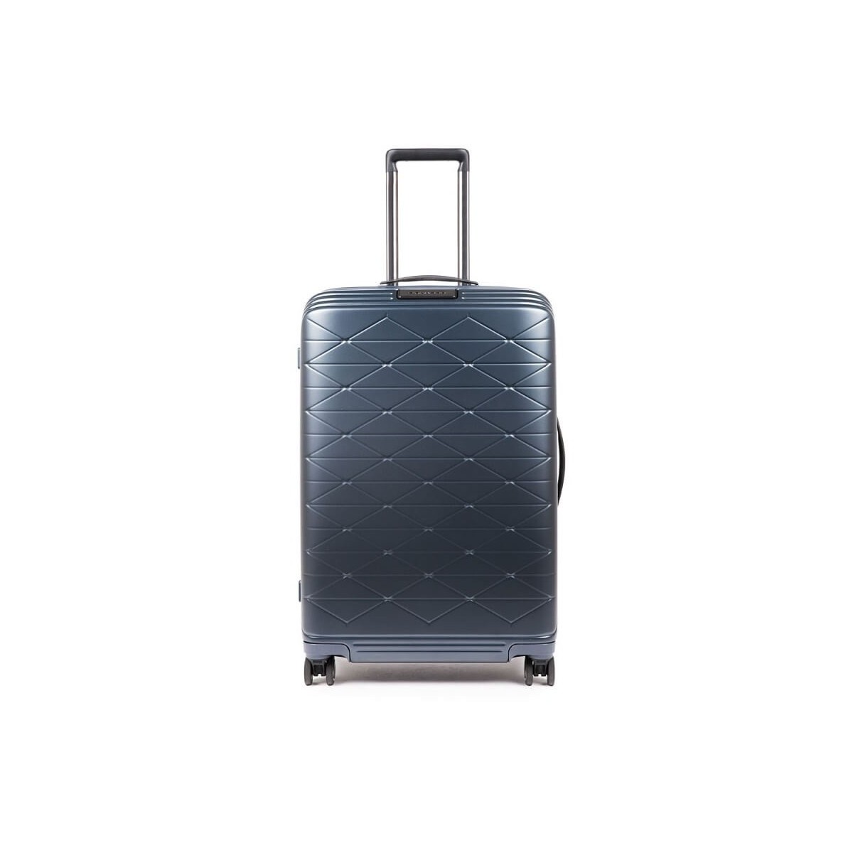 PIQUADRO Medium rigid four-wheeled trolley with TSA lock and customizable tag from the PiQ Biz collection in embossed blue polycarbonate.