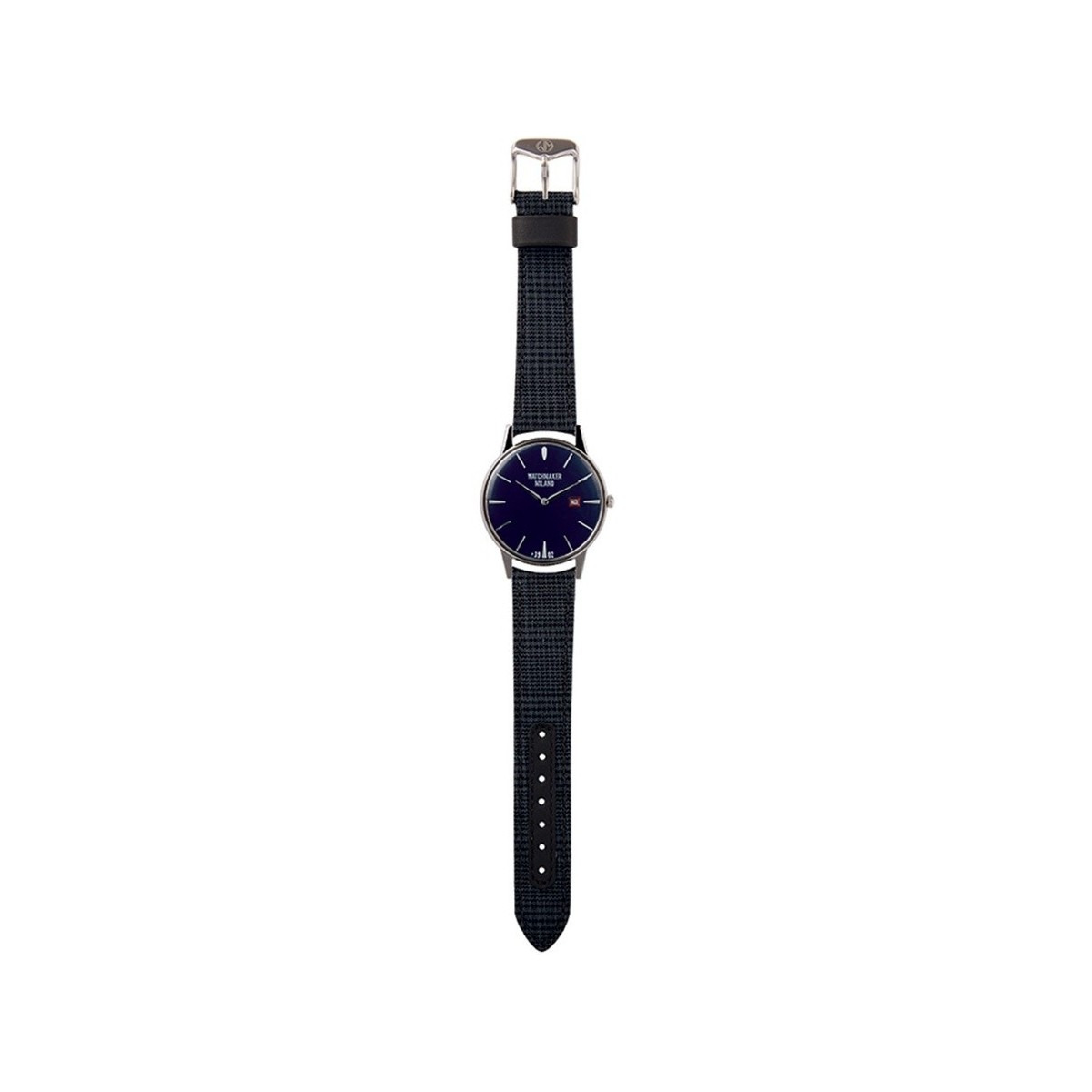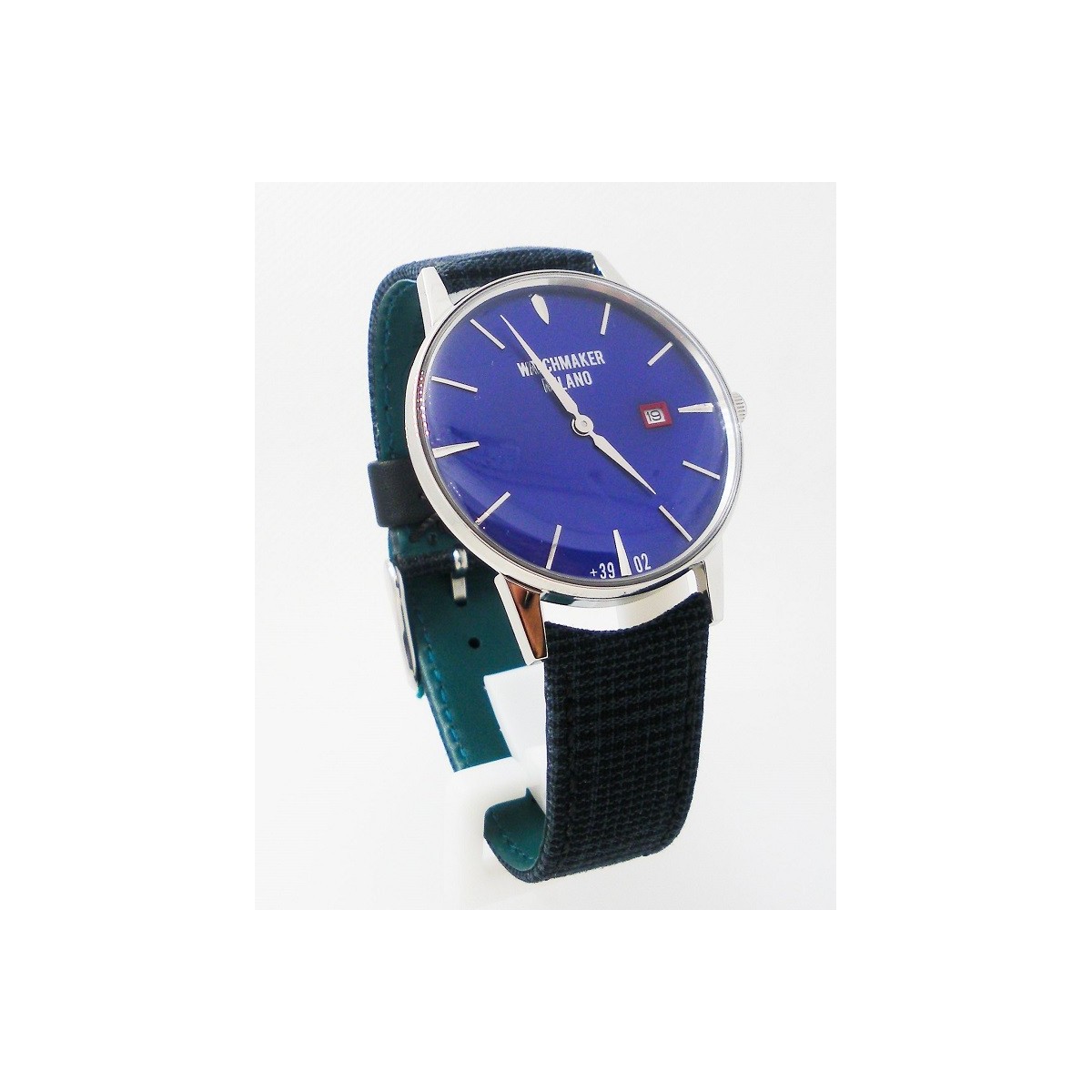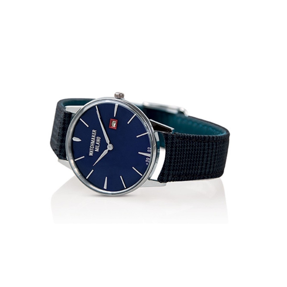 Watchmaker Milano line Ambrogio Vintage watch with blue dial, leather and fabric strap blue and gray checked shirt, quartz movement and dater
