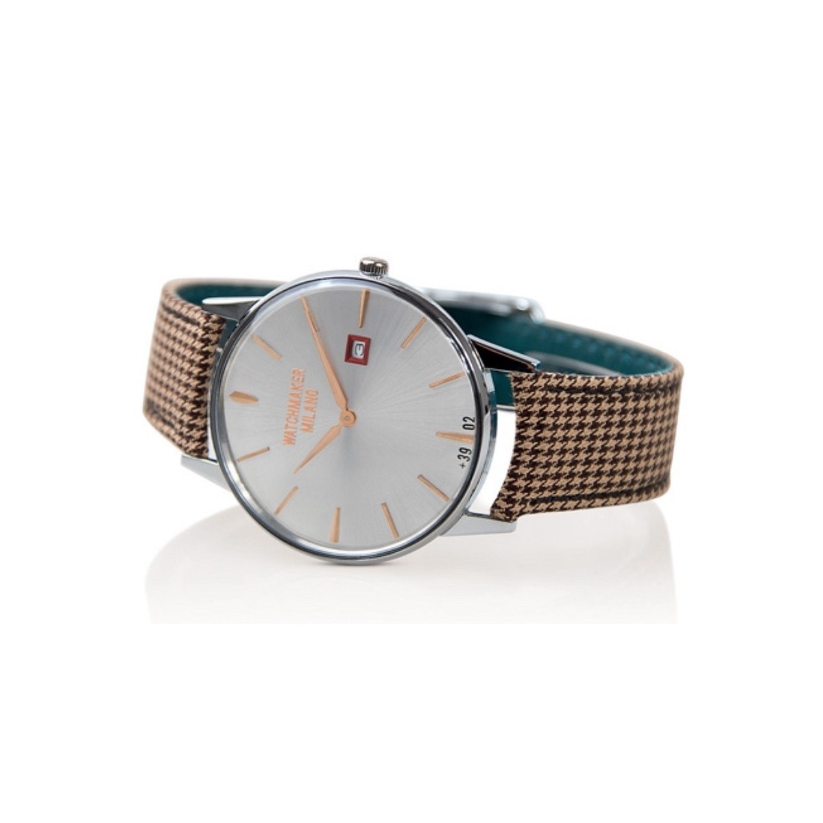 Watchmaker Milano line Ambrogio Vintage watch with silver dial and gold indices, leather and fabric black and beige checked strap, quartz movement and dater