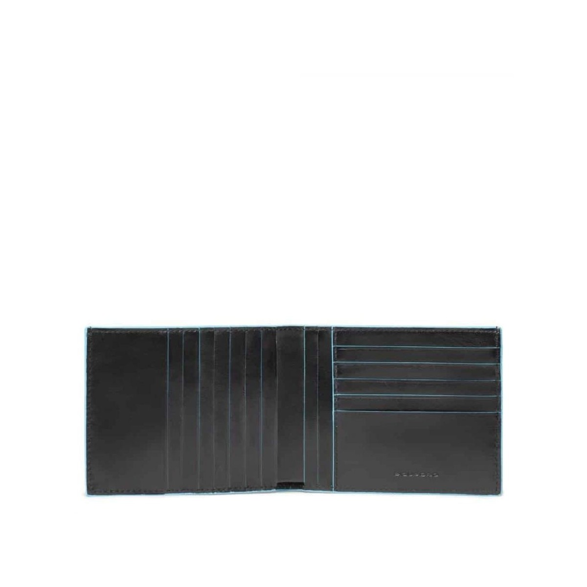 Piquadro Blue Square model wallet with book opening for men made in cowhide with a fine grain and soft to the touch in black leather and with hand-worked blue details. Model with 12 credit card slots and RFID anti-fraud protection.