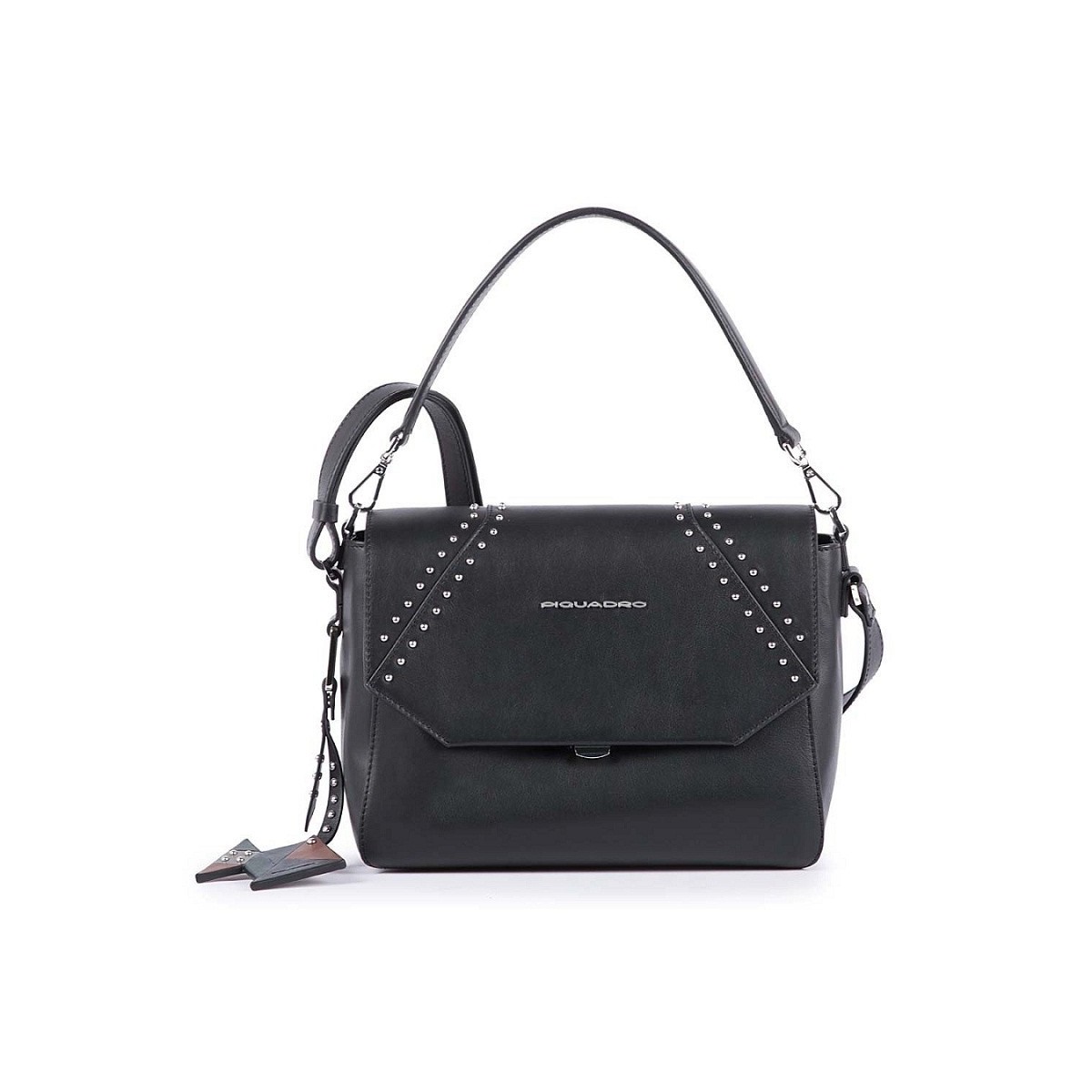 - Woman shoulder bag from the Muse line in black leather with studs and double wearability, shoulder or arm. Fanciful and compact for a rock and roll look. The Muse collection consists of exclusively feminine bags and accessories with shiny-finish metal details; in this case the leather used is of calf with a semi-gloss finish.