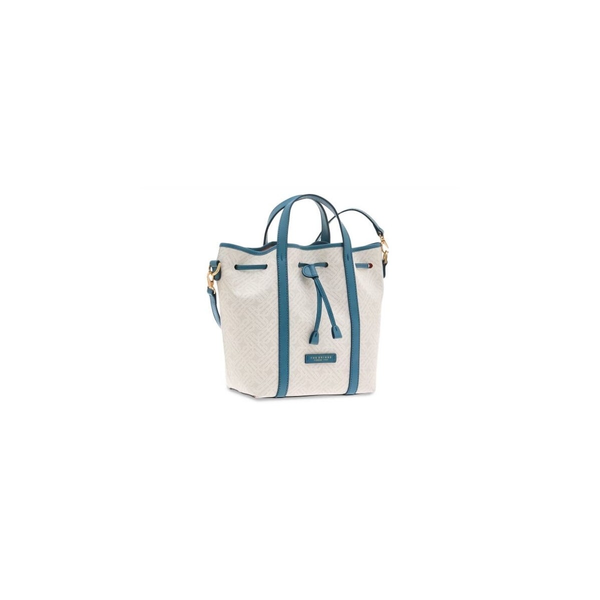 With an essential and elegant design, The Bridge bucket, from the Anna collection, is made of milk-colored fabric with a tone-on-tone printed background; handles, piping and logo in real light blue leather.