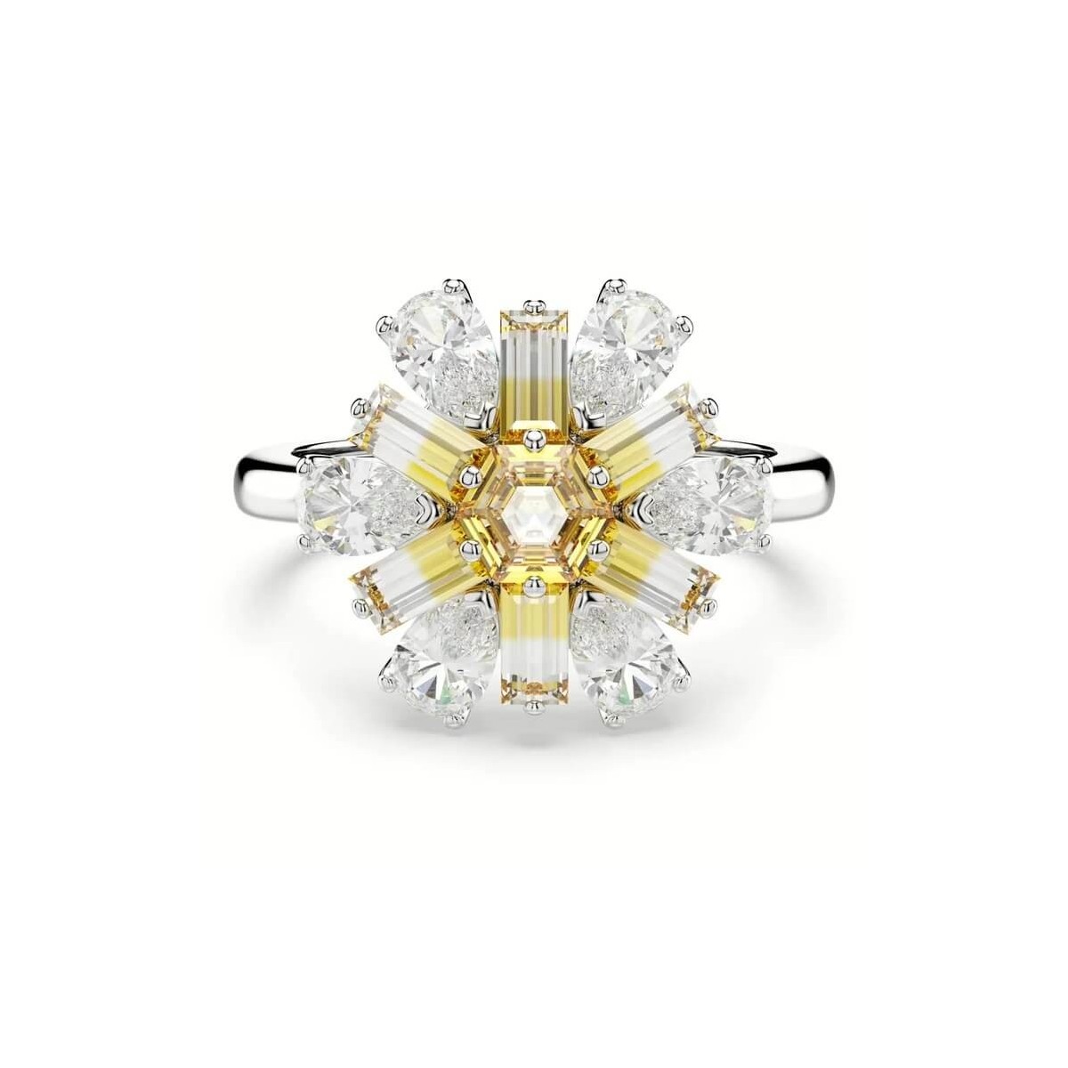 Si ispira alla primavera la nuova collezione di Swarovski, Idyllia, che propone questo elegantissimo anello con motivo fiore composto da Zirconia Swarovski giallo centrale incorniciato da piccoli raggi ad effetto sfumato di cristallo bianco su montatura placcata rodio.