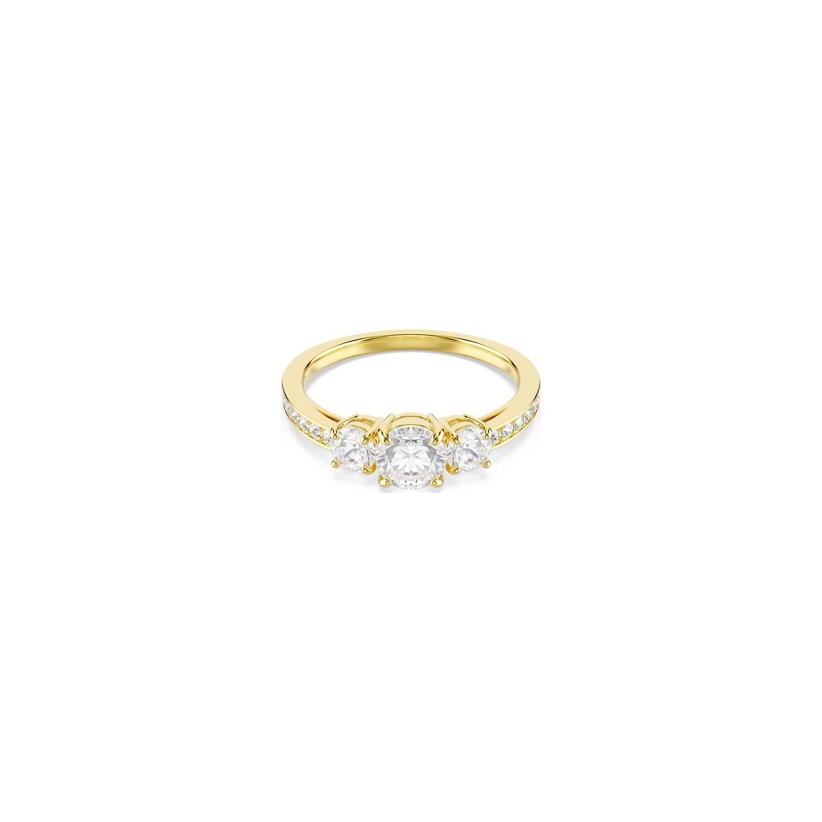Anello da donna Swarovski, della collezione Stilla Attract, realizzata con fascia placcata in tonalità oro e 3 cristalli bianchi Cry centrali e cristalli bianchi piccoli laterali.