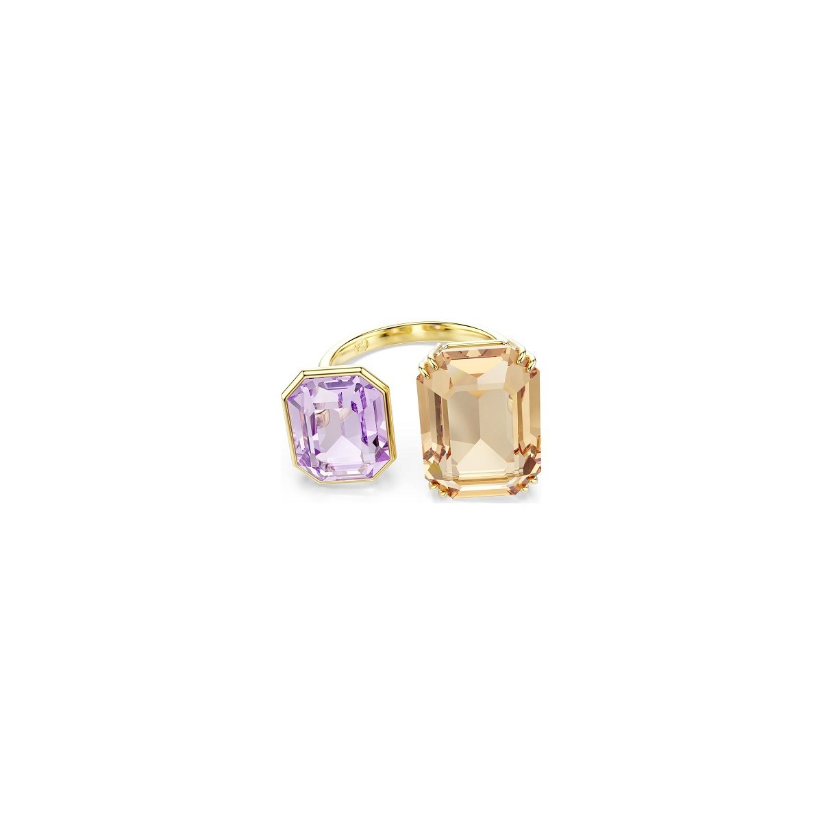 Anello con cristalli taglio ottagonale, della collezione Millenia, da donna Swarovski, realizzato in tonalità oro presenta un cristallo viola con montatura a castone su un lato e un cristallo color caramello sull'altro lato con una montatura a griffe doppia.