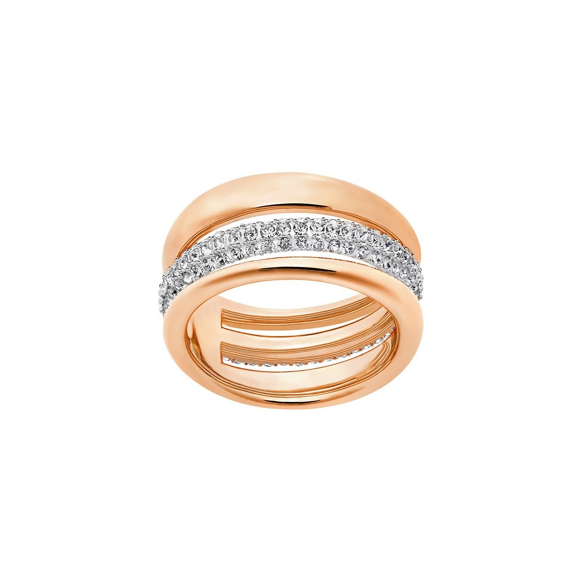 Classico e contemporaneo allo stesso tempo, ecco un anello dalla vestibilità totale, Il suo profilo organico propone una composizione di tre anelli a fascia incrociati, interpretati in metallo placcato oro rosa e pavé di Clear Crystal. Indossatelo da solo per uno stile classico, e con altri anelli se preferite accentuarlo.
