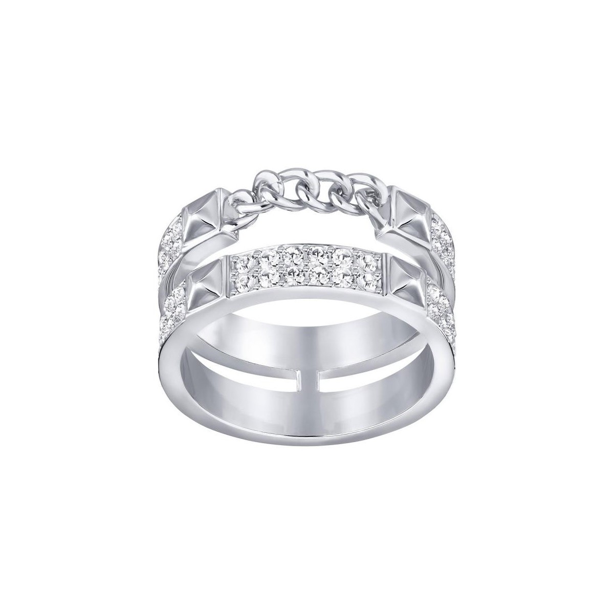 Brillantezza contemporanea dal tocco rock per il raffinato anello che impreziosirà il vostro guardaroba da giorno o da sera. L’attuale profilo multiplo propone un motivo rigido a catenella, borchiette in metallo rodiato e la preziosa presenza del pavé di Clear Crystal.