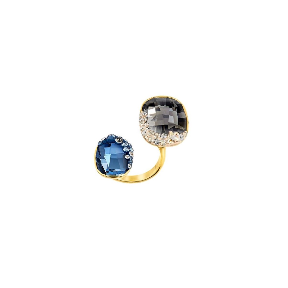 Anello dal profilo aperto placcato oro con cristalli Swarovski grigio e blu e pavè bianco. Misura 55