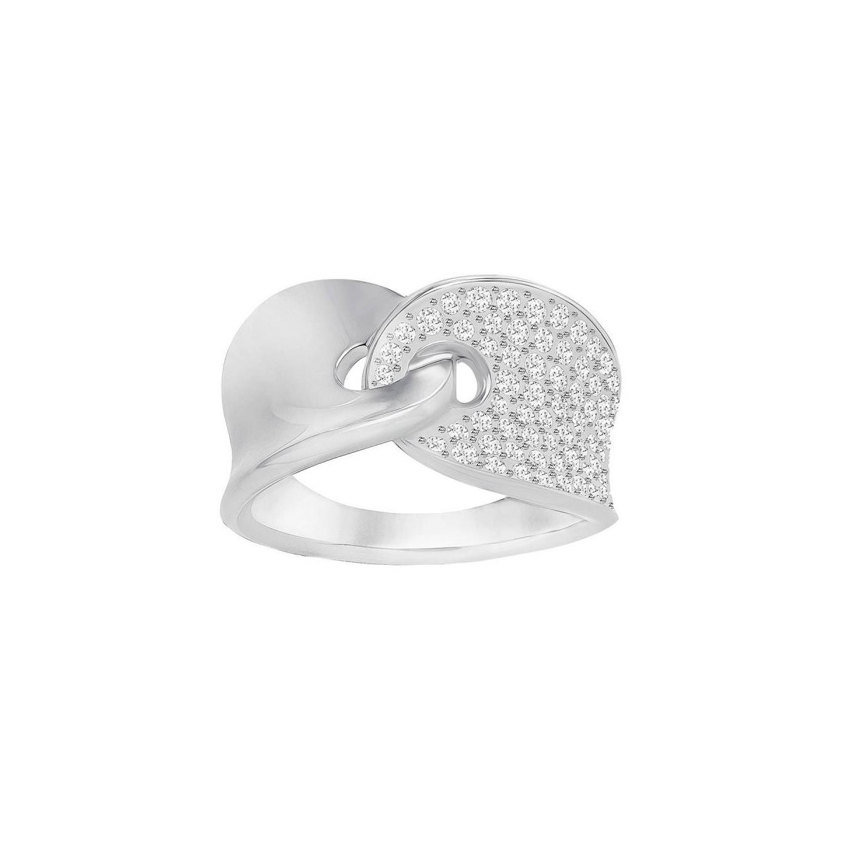 Il profilo attuale e coeso di questo anello, che alterna la levigatezza del metallo rodiato alla preziosità del pavé di Clear Crystal, sottolineerà ogni occasione con la sua brillantezza discreta. Il gioiello è composto da due forme congiunte ed è altamente coordinabile con altre creazioni Swarovski.